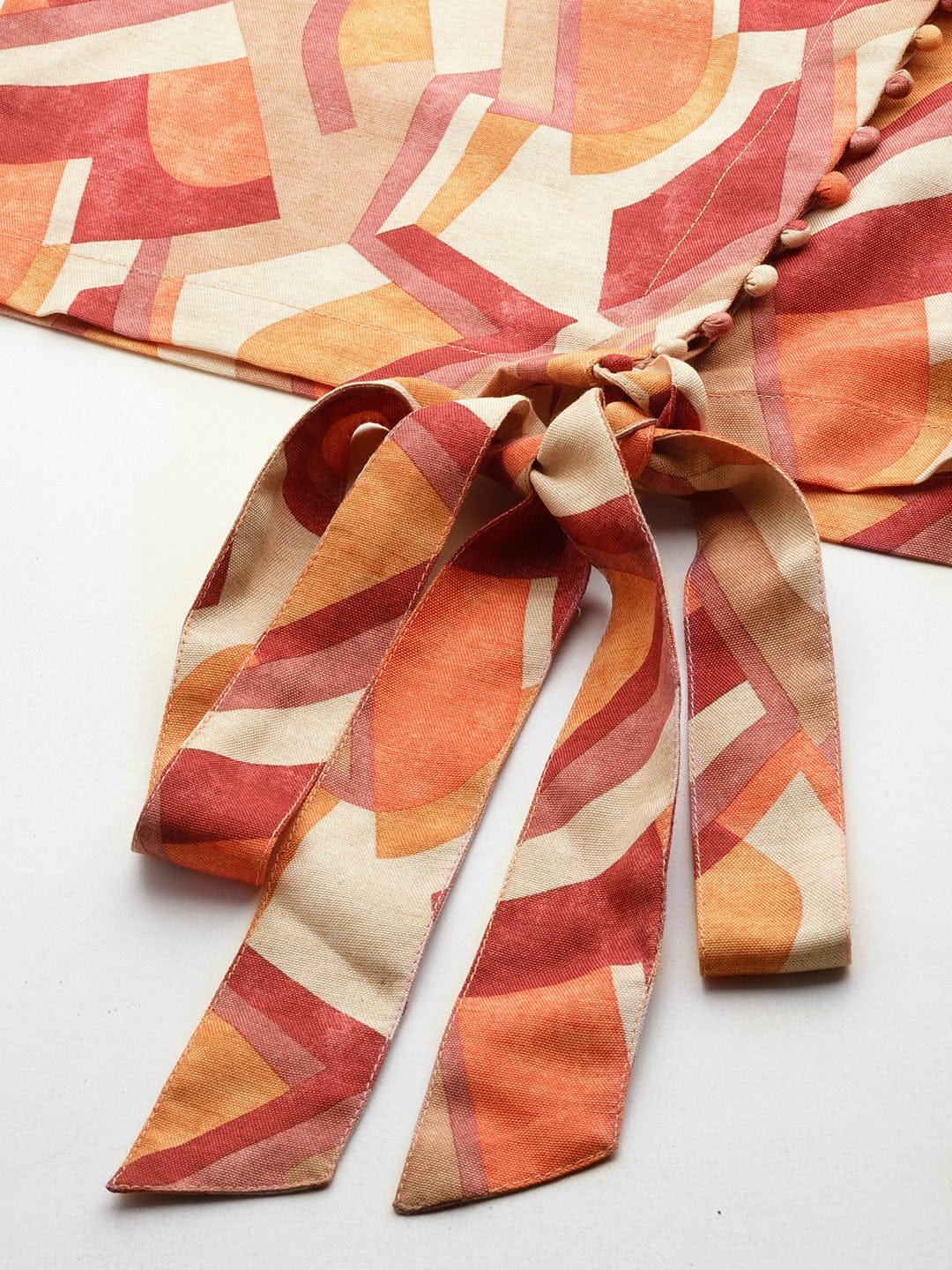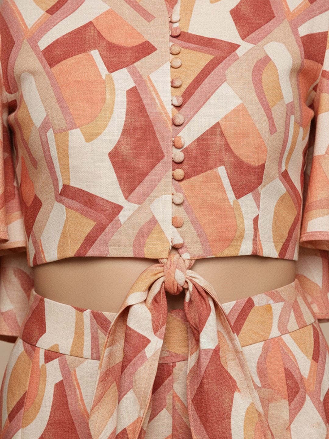 KSUT Women Beige Multicolour Flared Sleeves, Front Open With Tie Up Details Crop Top Paired With Flared Bottom