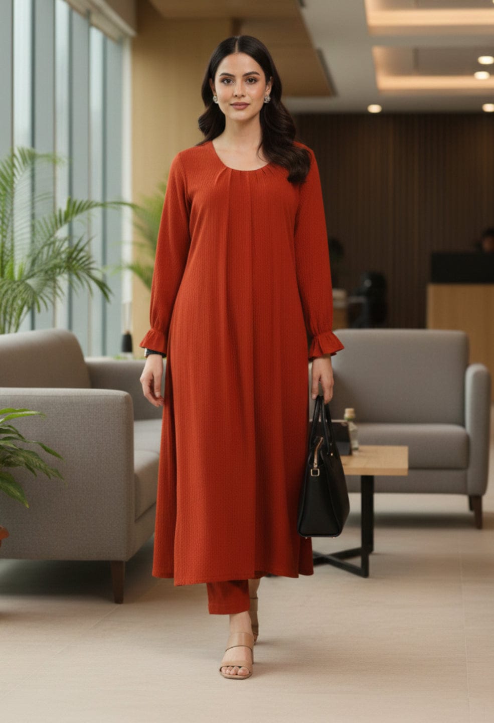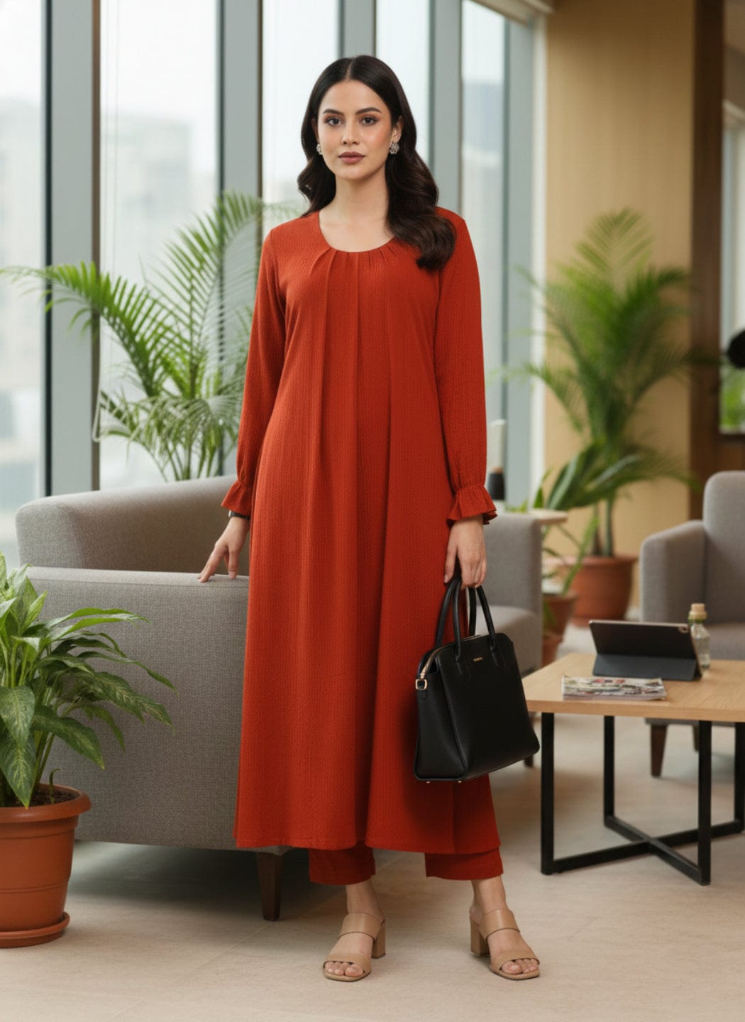 Varanga Women Rust Colour, Bishop Sleeve A-Line Kurta Paired With Tonal Bottom