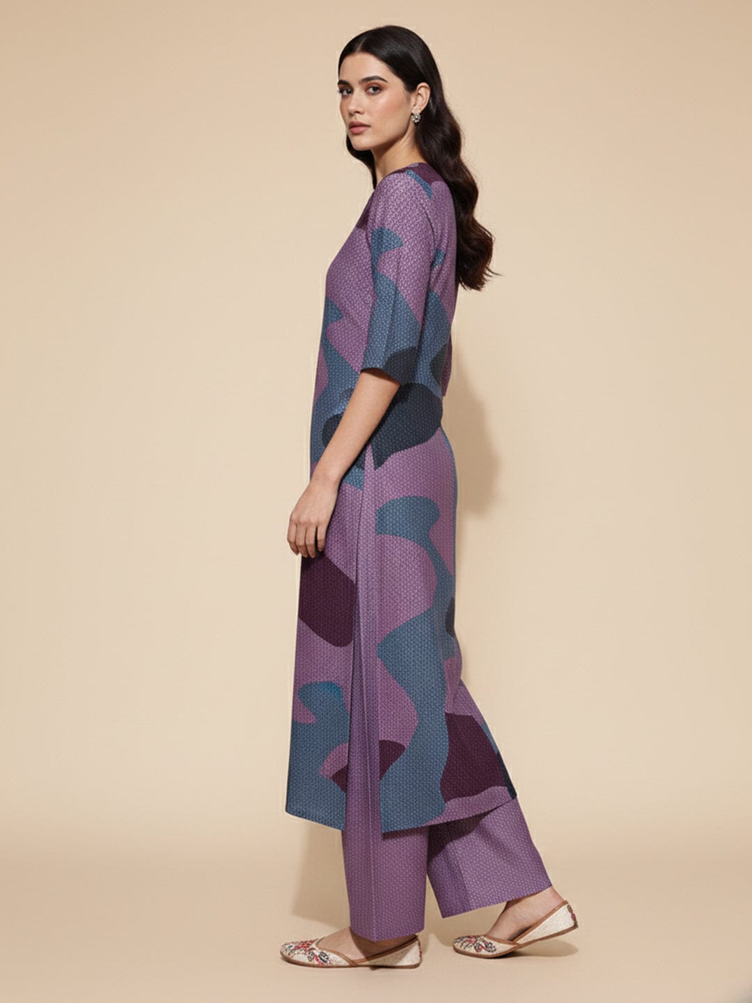 KSUT abstract printed mandarin collar, high low straight kurta with side slits paired with tonal bottom