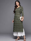 Varanga Olive Green Ethnic Motifs Printed Gotta Patti Straight Kurta with Button Detail