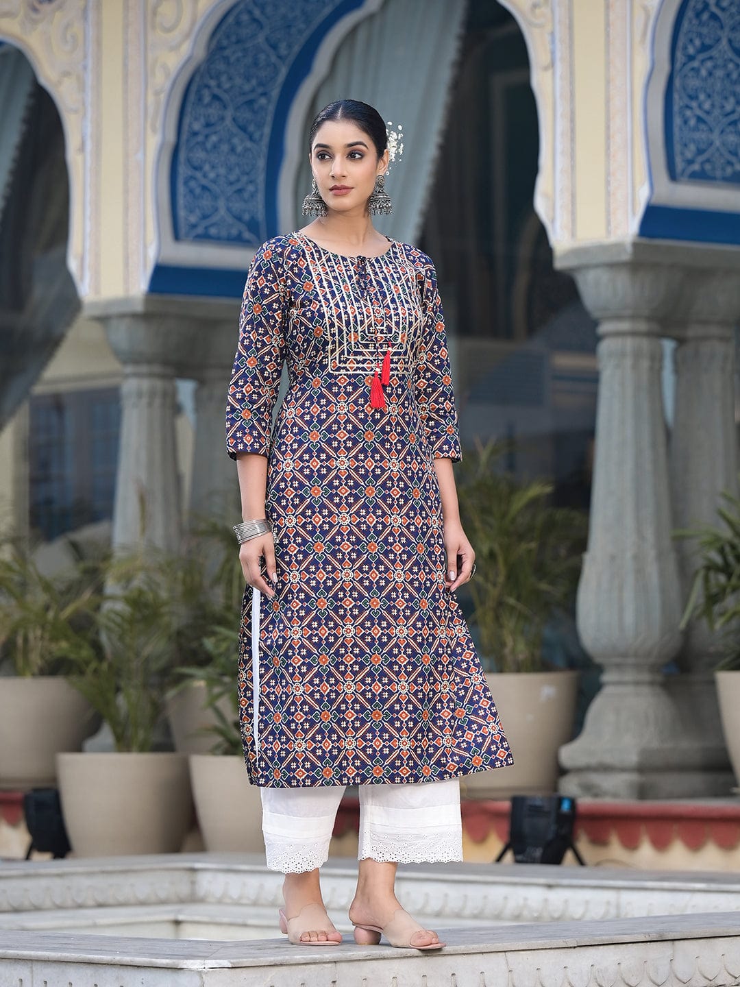 Elevate Your Wardrobe: Varanga Women's Blue and Beige Abstract Printed Kurta with Gota Work on Yoke and 3/4 Sleeves - Shop Now!