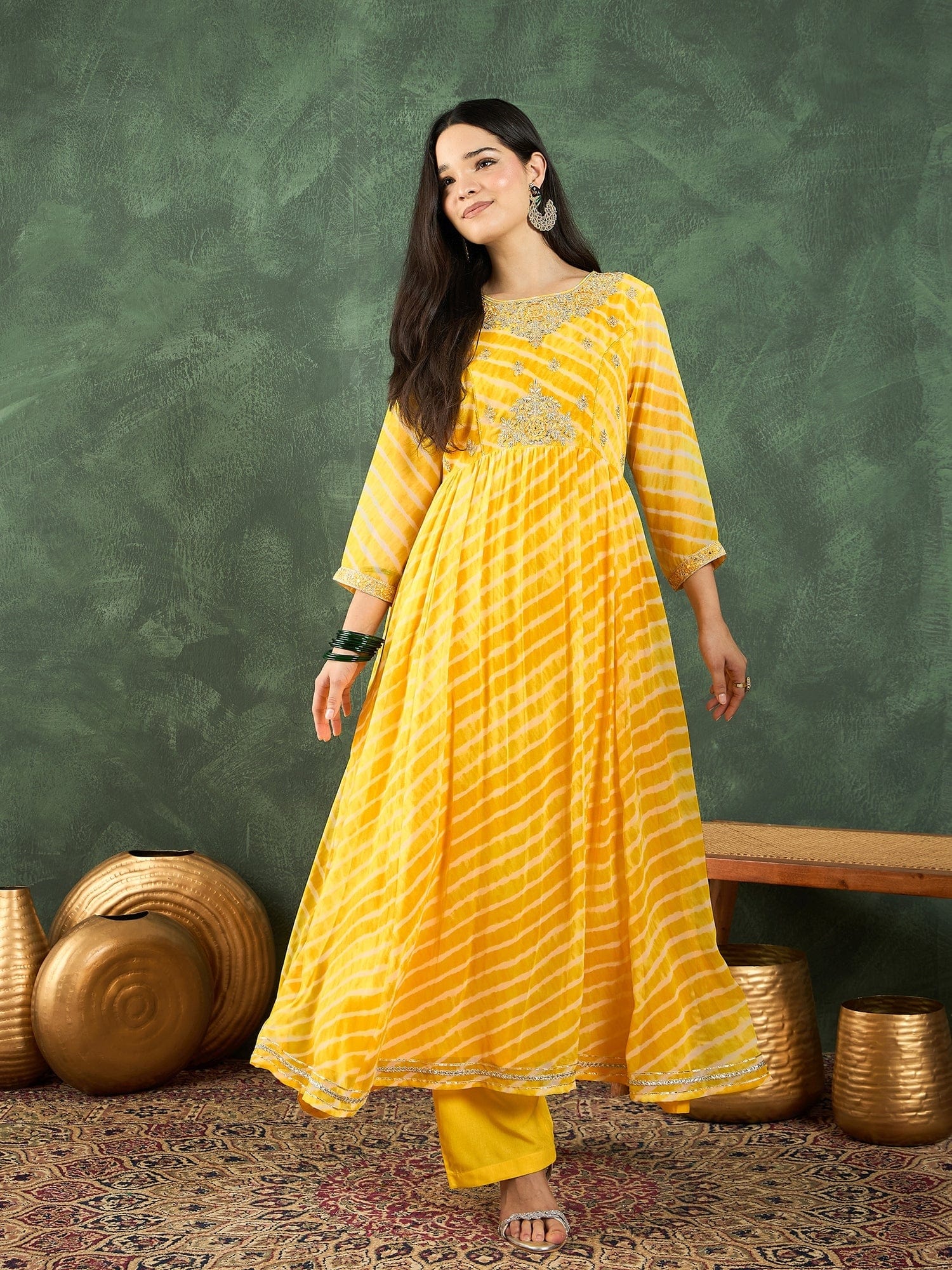 Varanga leheriya-printed Anarkali kurta with subtle zari detailing