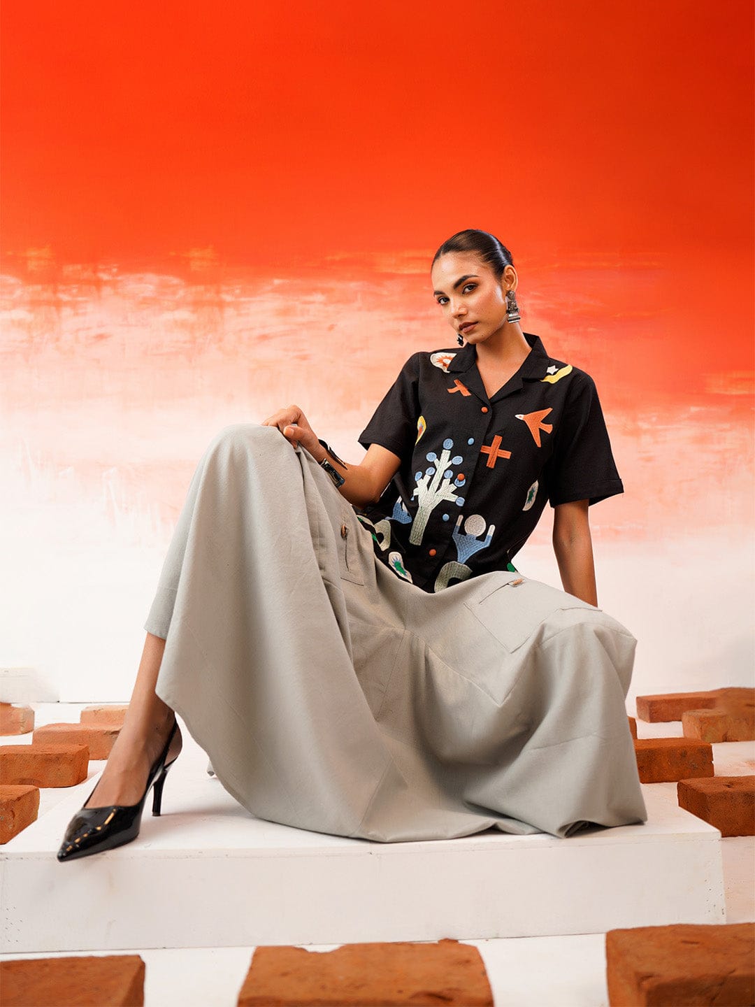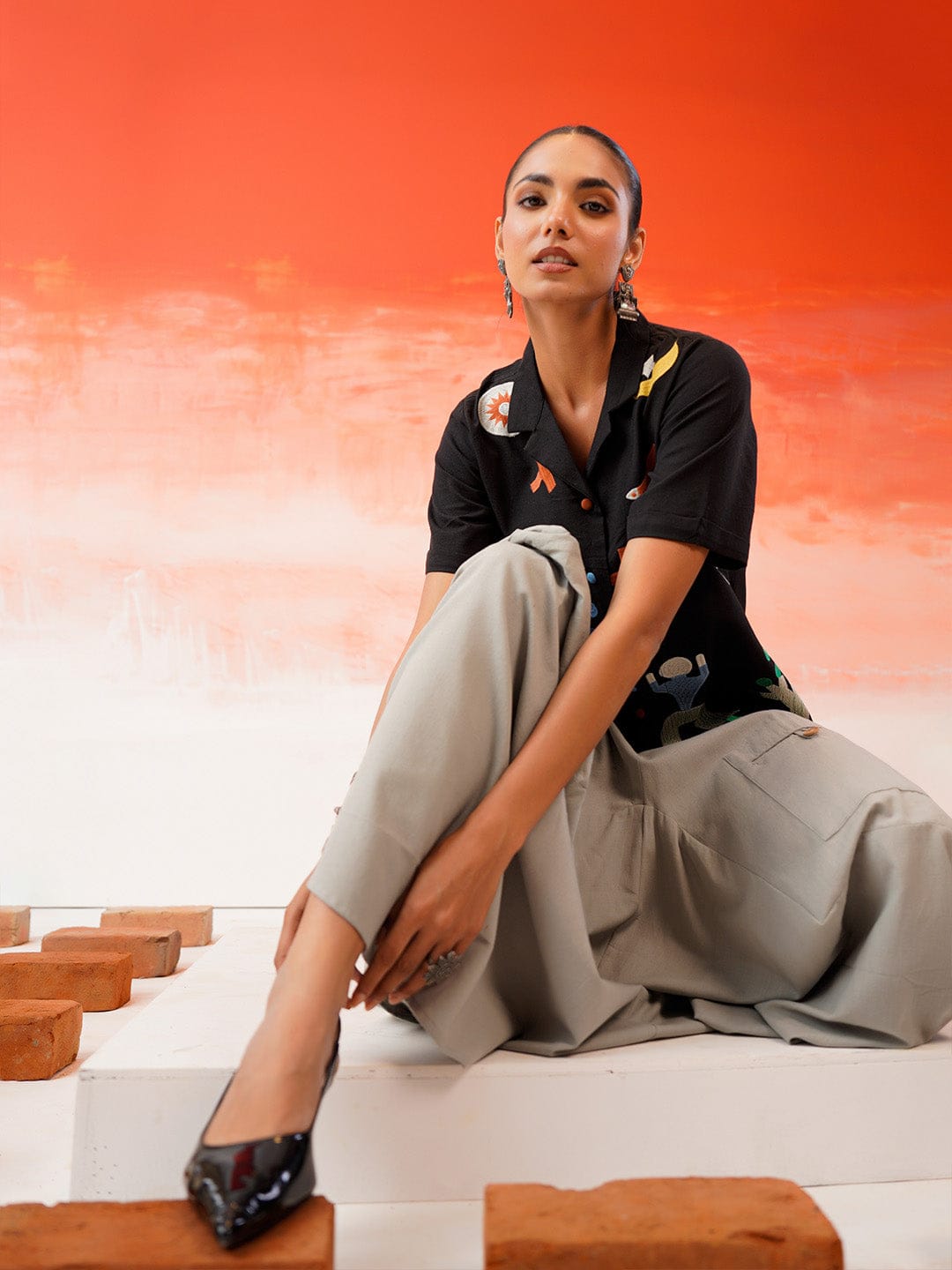 Abstract Handprinted Geometric Icon Print Short-Sleeve Button-Up Shirt