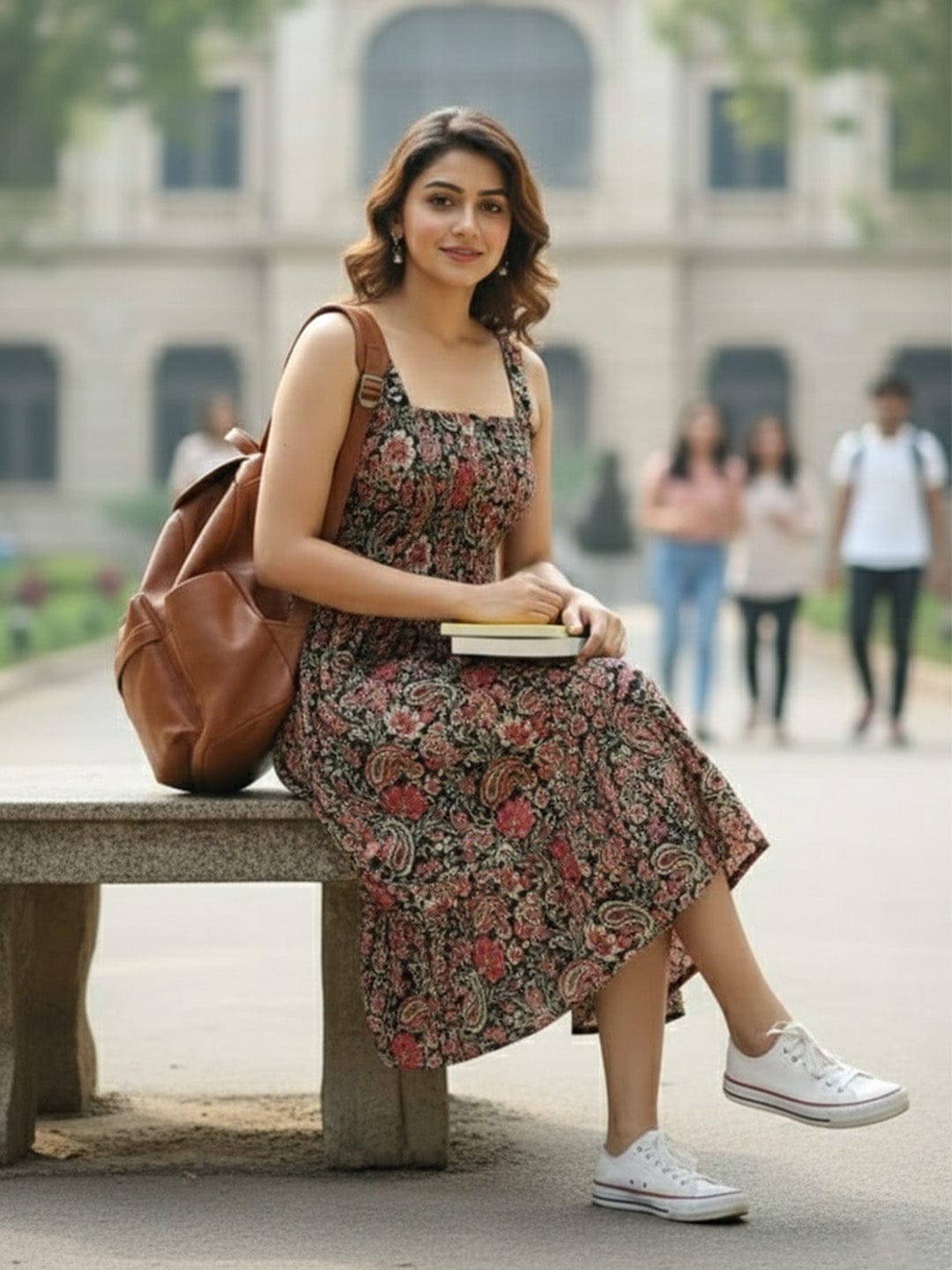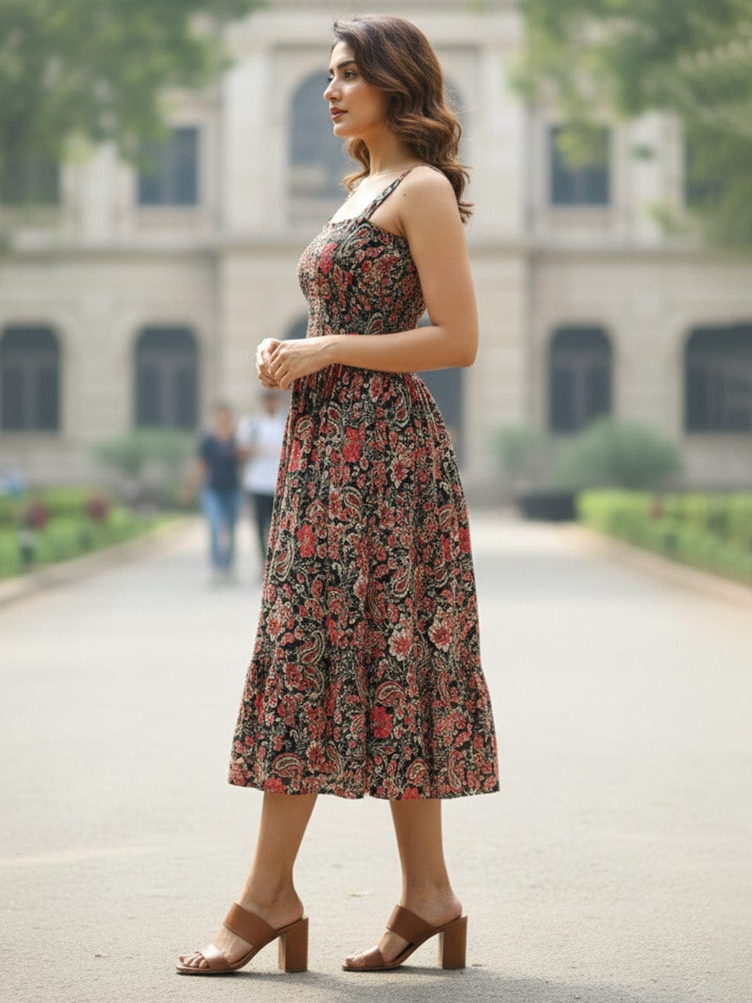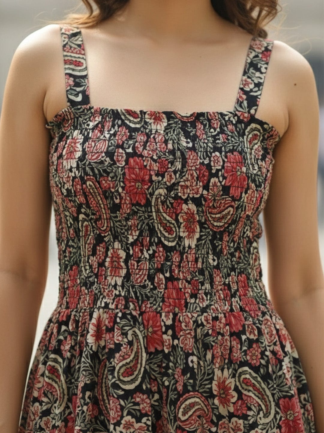Black Floral Printed Sleeveless A-Line Dress with Halter Neck and Smocked Bodice