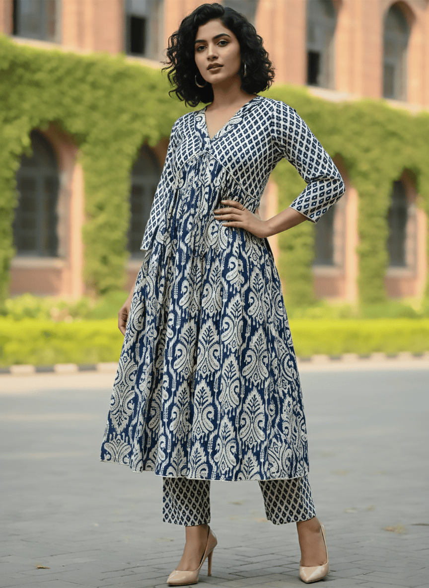 Classic ikat print Aliya-cut kurta in blue and white, teamed with regular-fit ankle-length trousers.