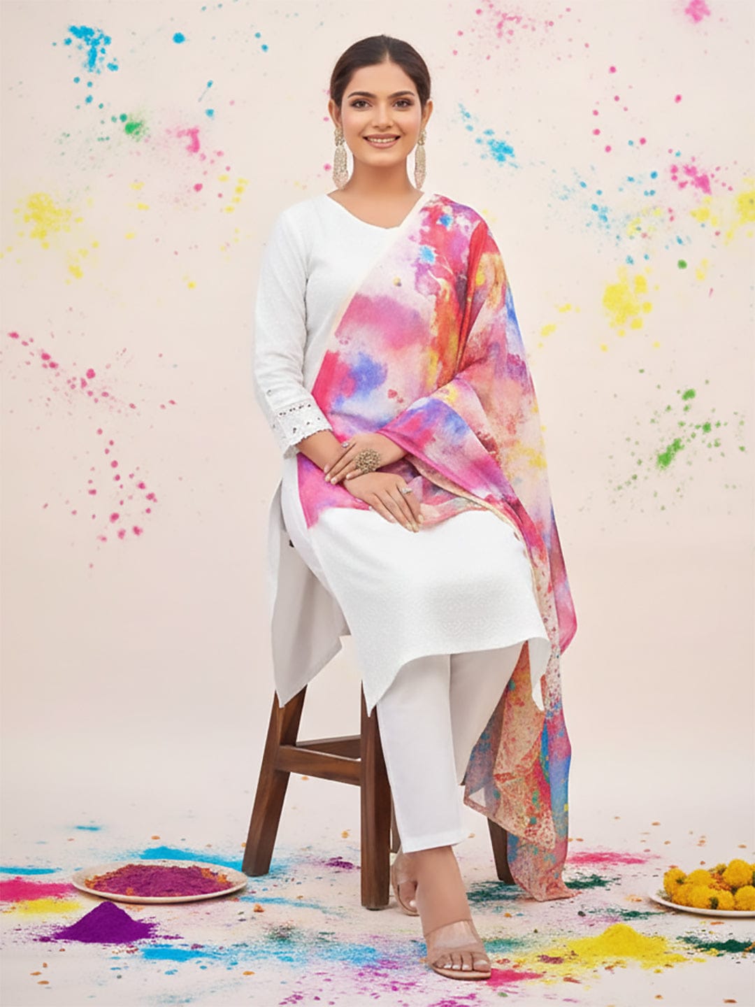Varanga Women Self Embroidered Schiffli Bordered Kurta with Trouser & Multicolor Dupatta