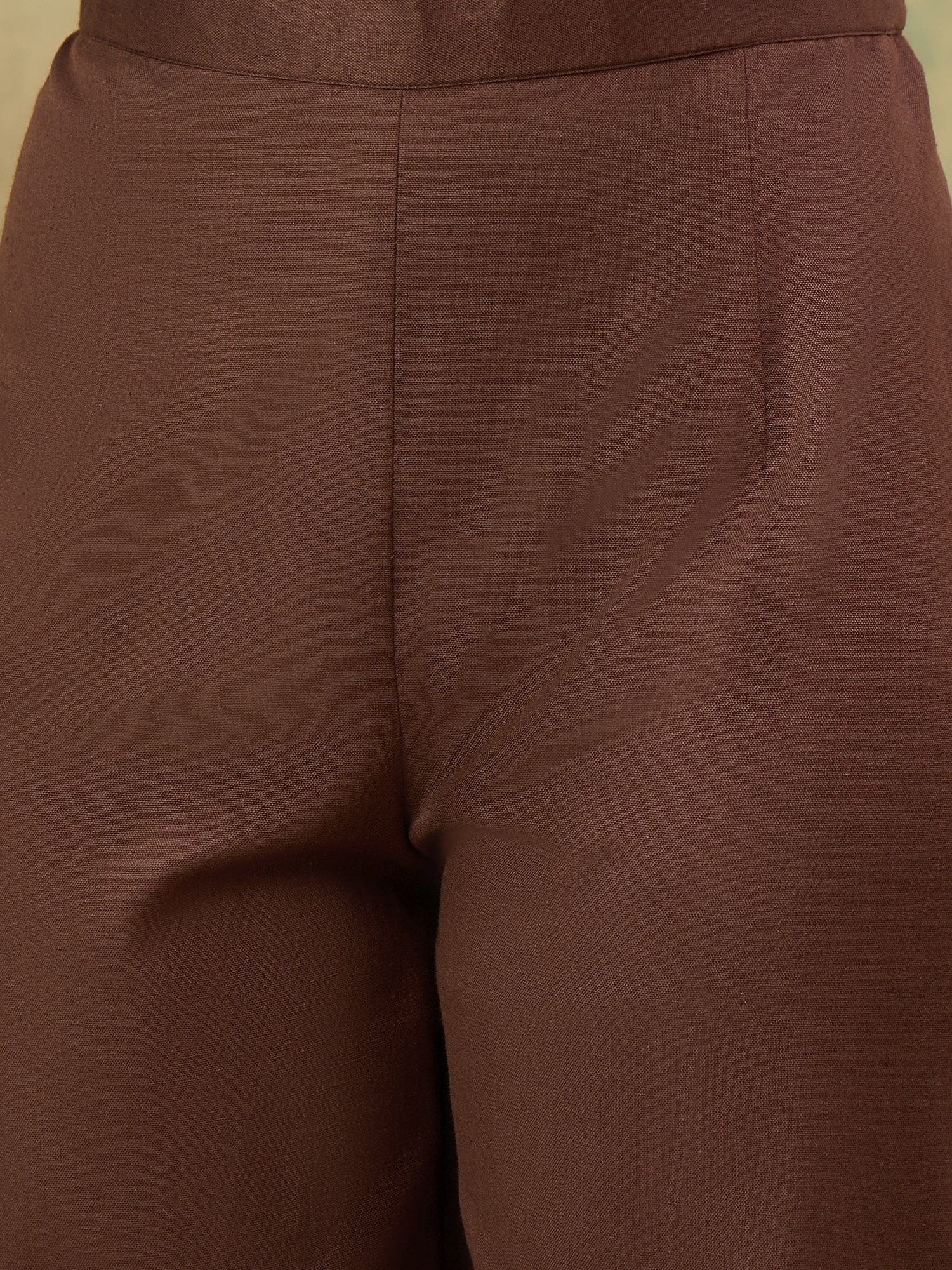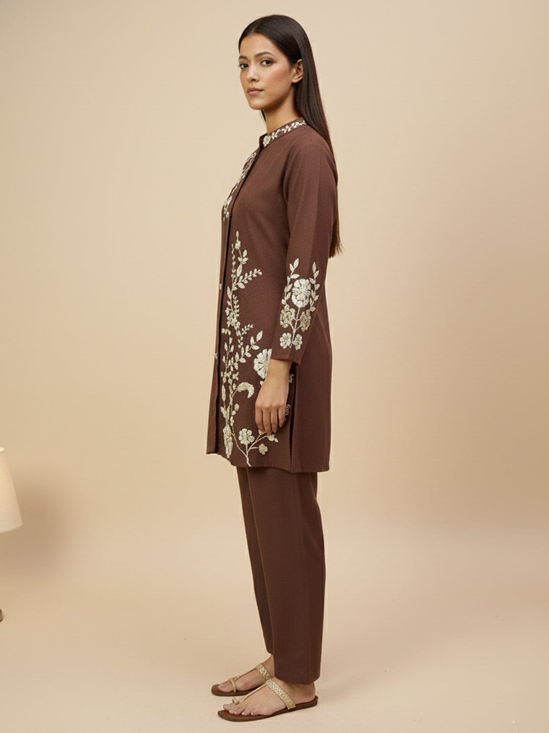 KSUT Women Elegant Brown Co-Ord Set Featuring Thread Embroidery , Paired With Ankle-Length Trousers For A Chic, Coordinated Look.