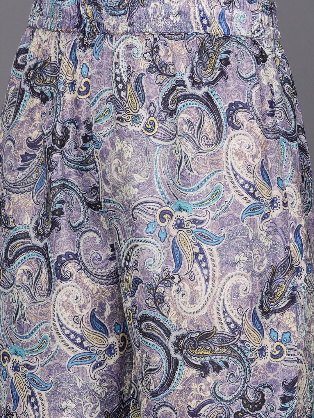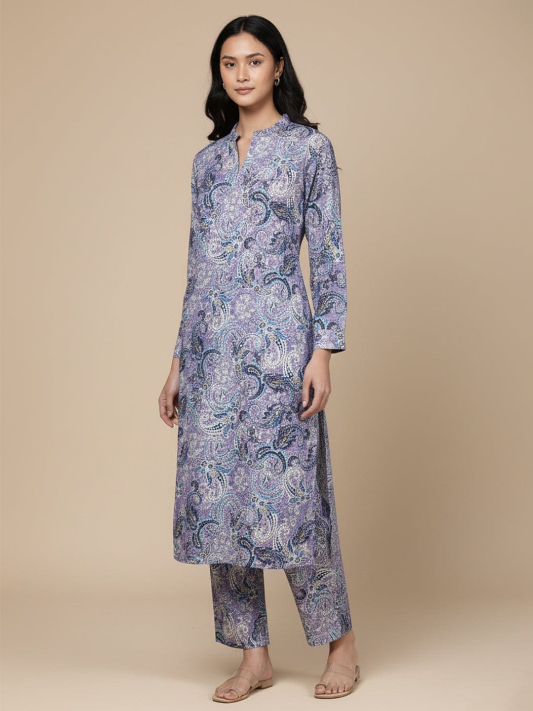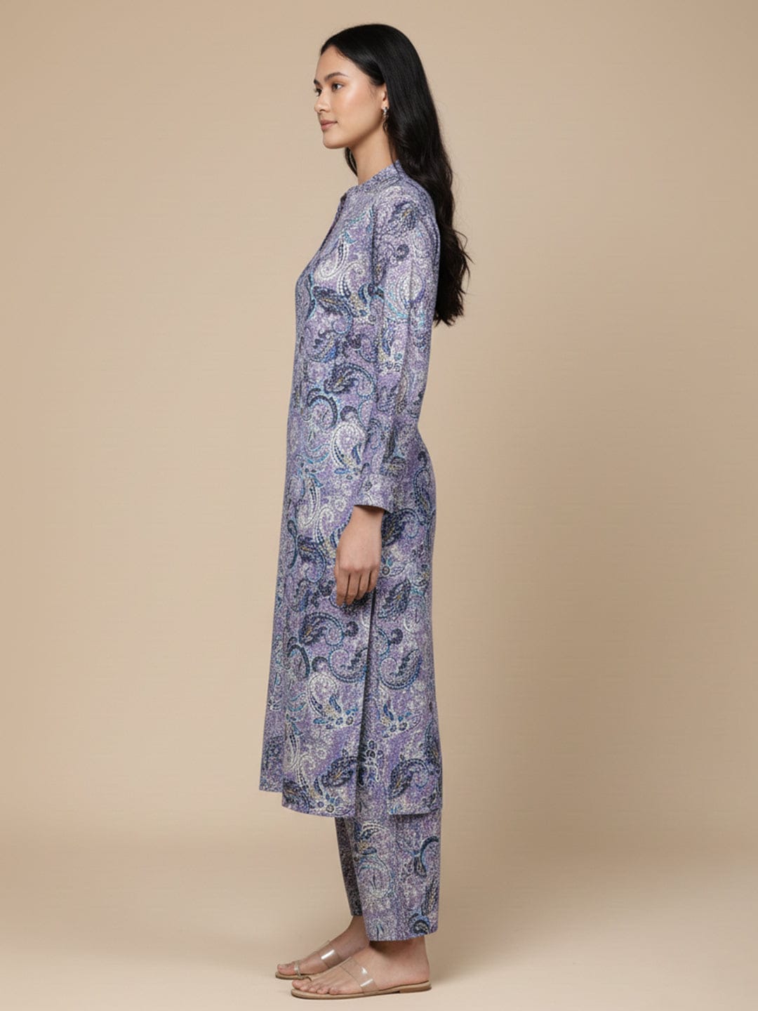 KSUT Women Lavender Paisley Printed Mandarin Collar With Slit Straight Kurta With Three Quarter Sleeves With Cuff Straight Kurta Paired With Tonal Bottom