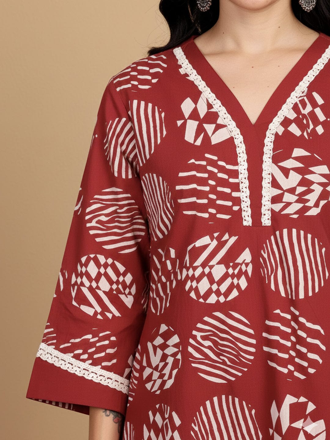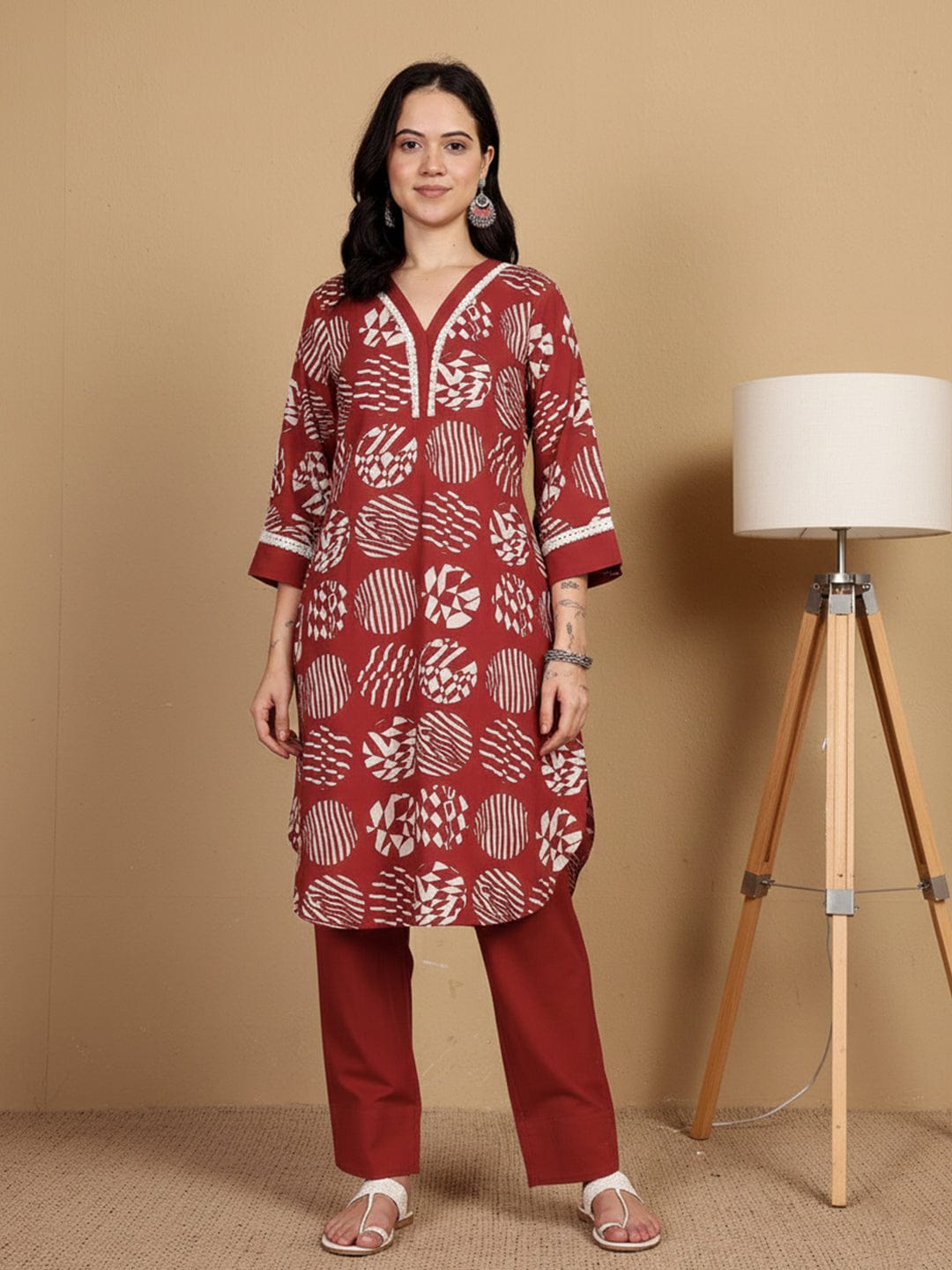KSUT Women Printed Kurta With Lace Details On Neck And Cuff Paired With Solid Trousers