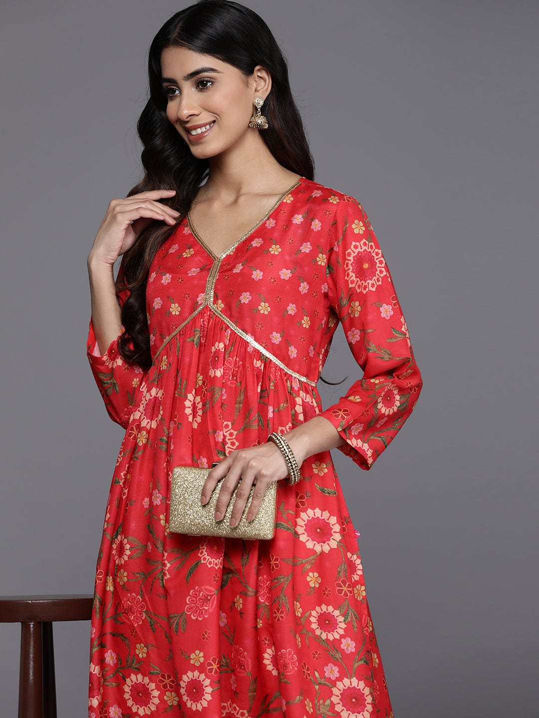KSUT Women Red Floral Printed Sequin Embellished A-Line Kurta With Three Quater Sleeves