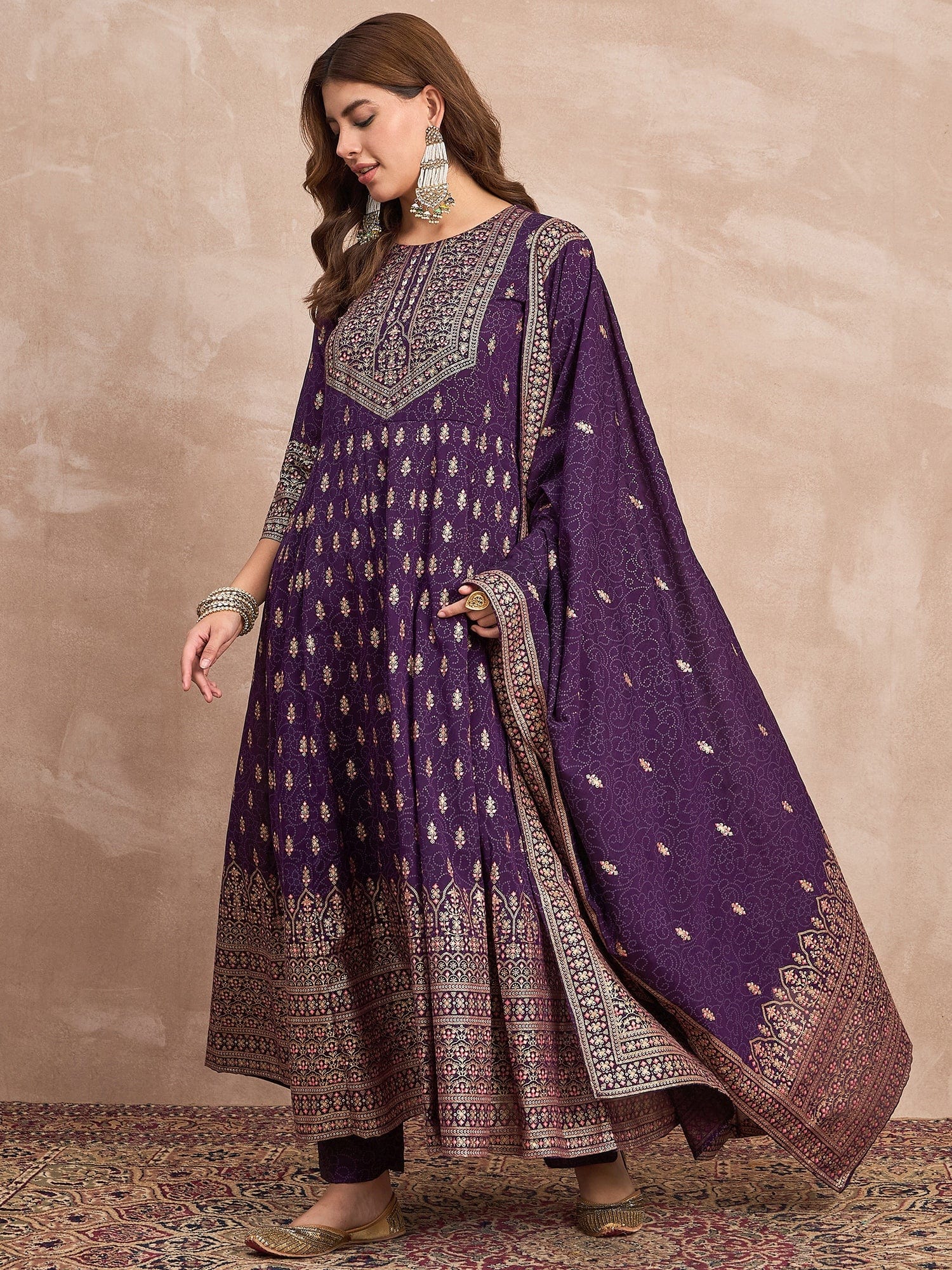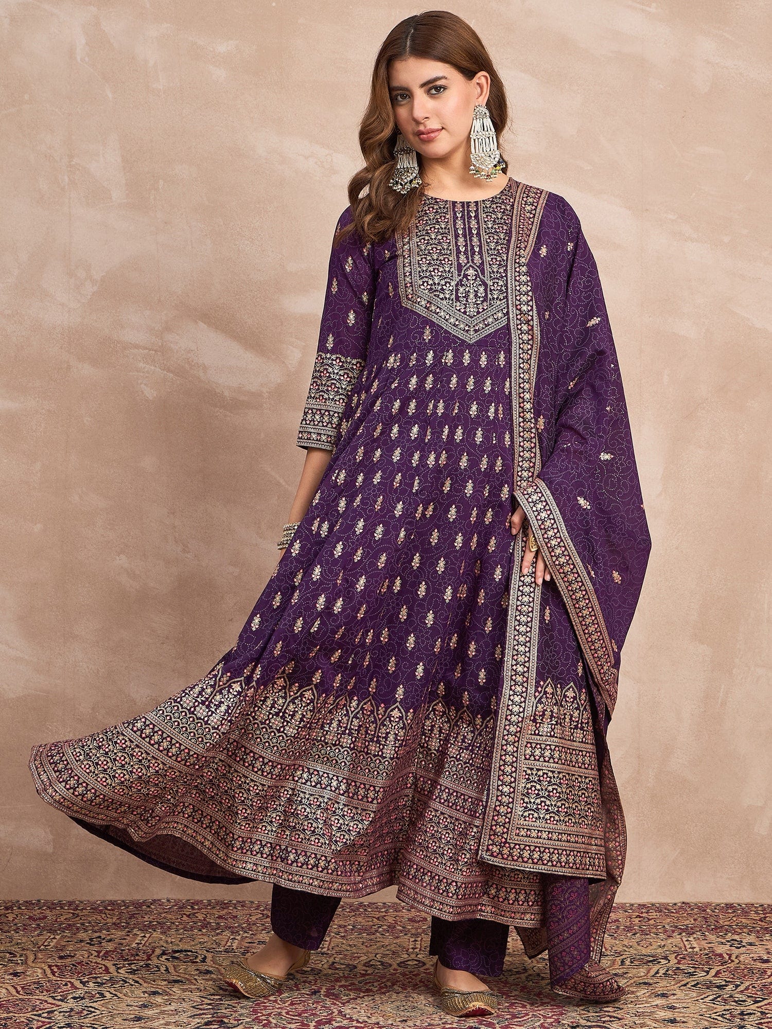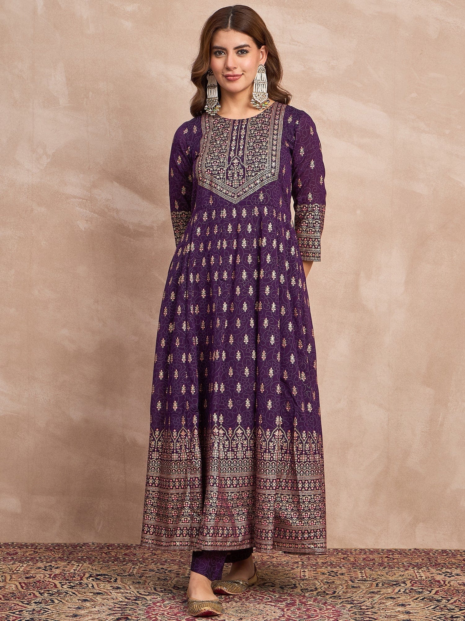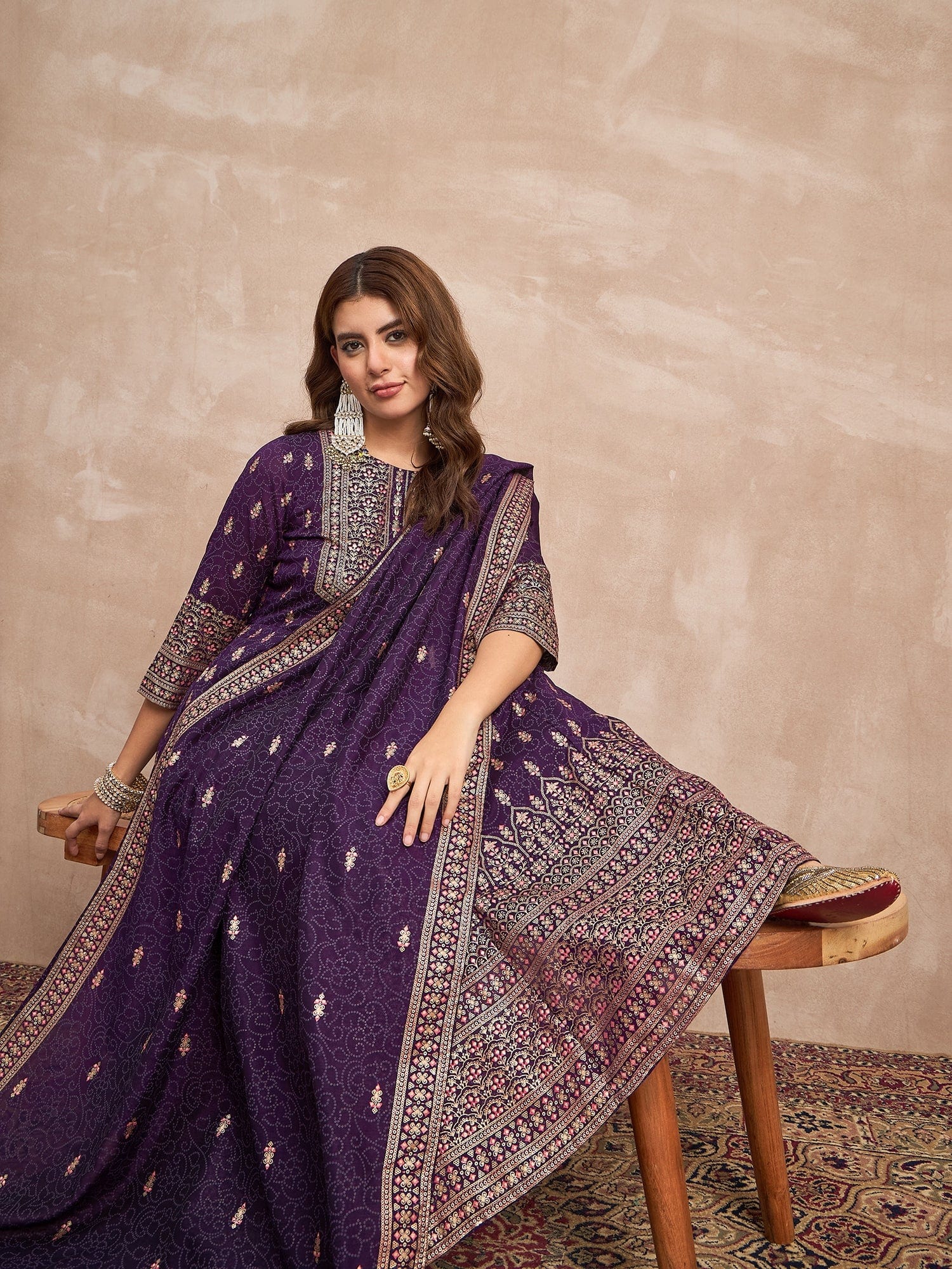 Purple Anarkali Kurta Paired With Trousers And Printed Dupatta