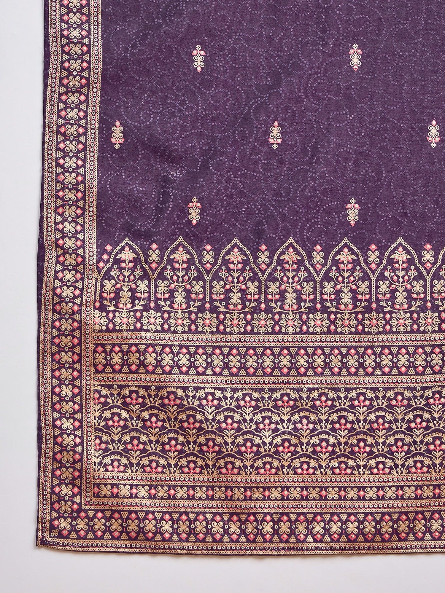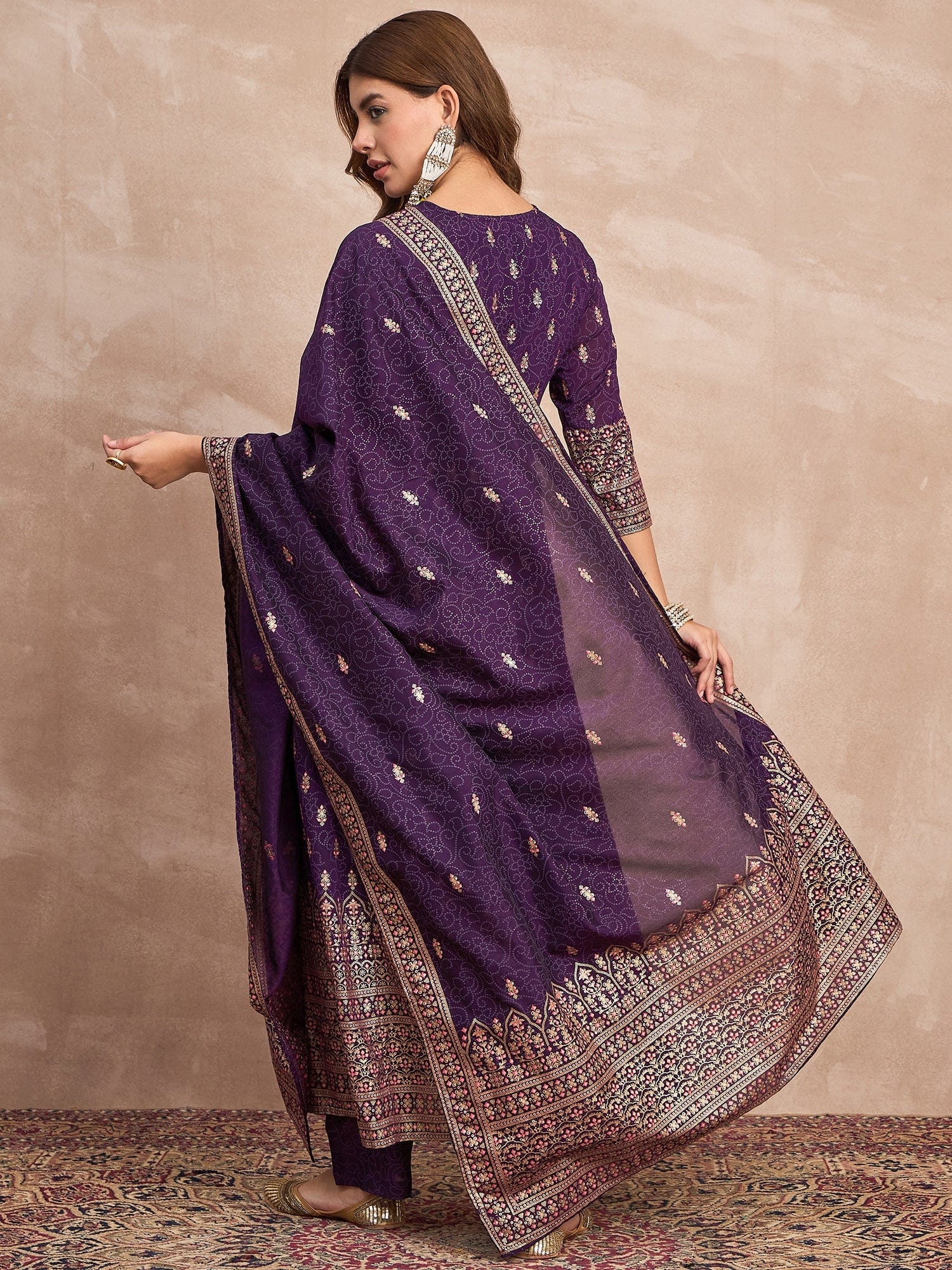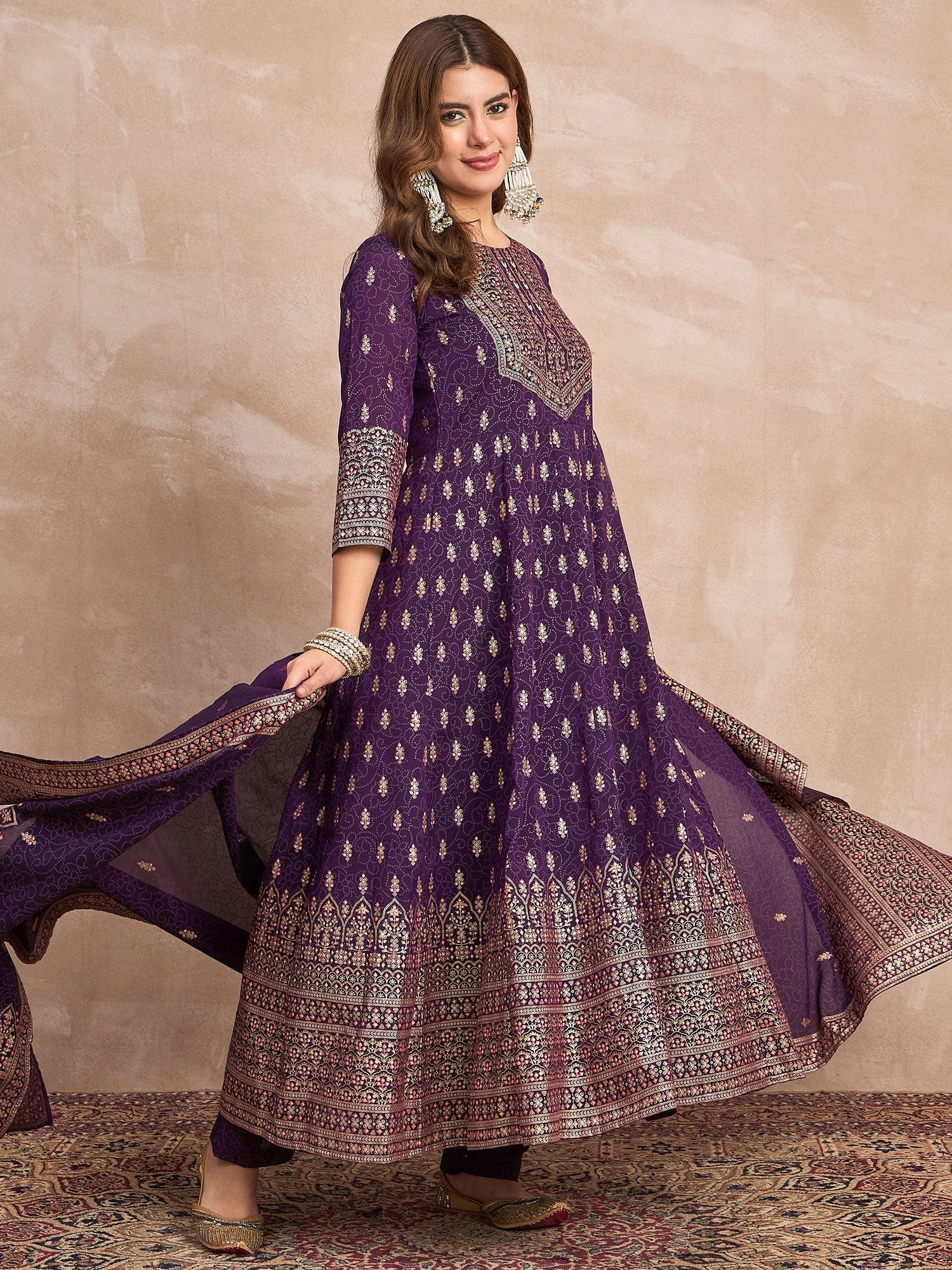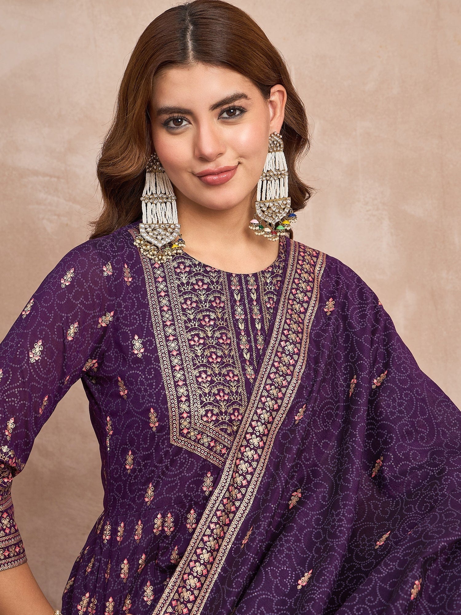 Purple Anarkali Kurta Paired With Trousers And Printed Dupatta