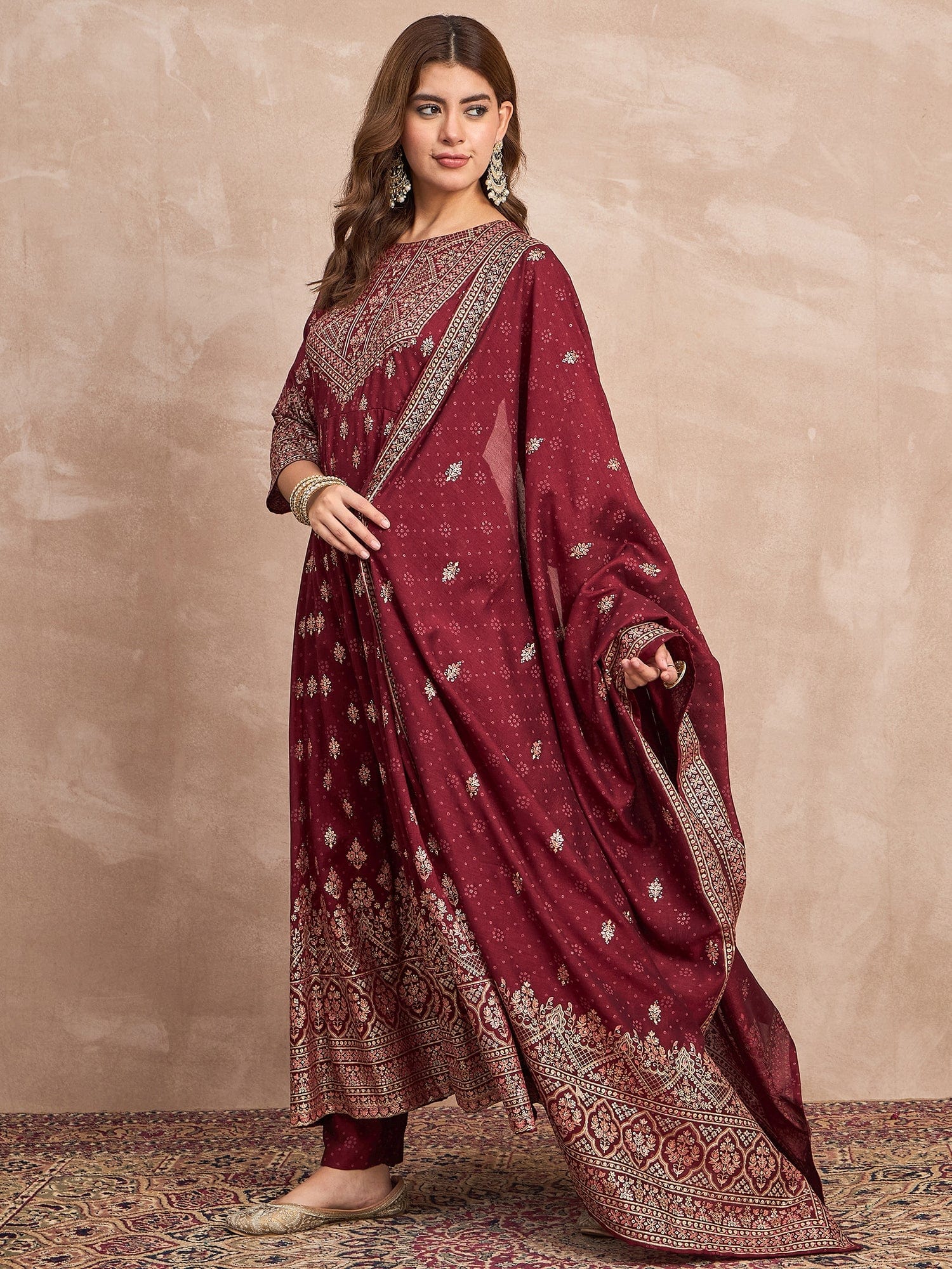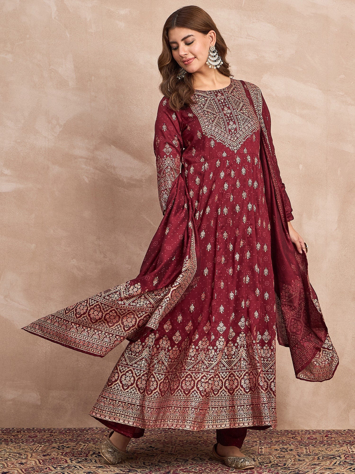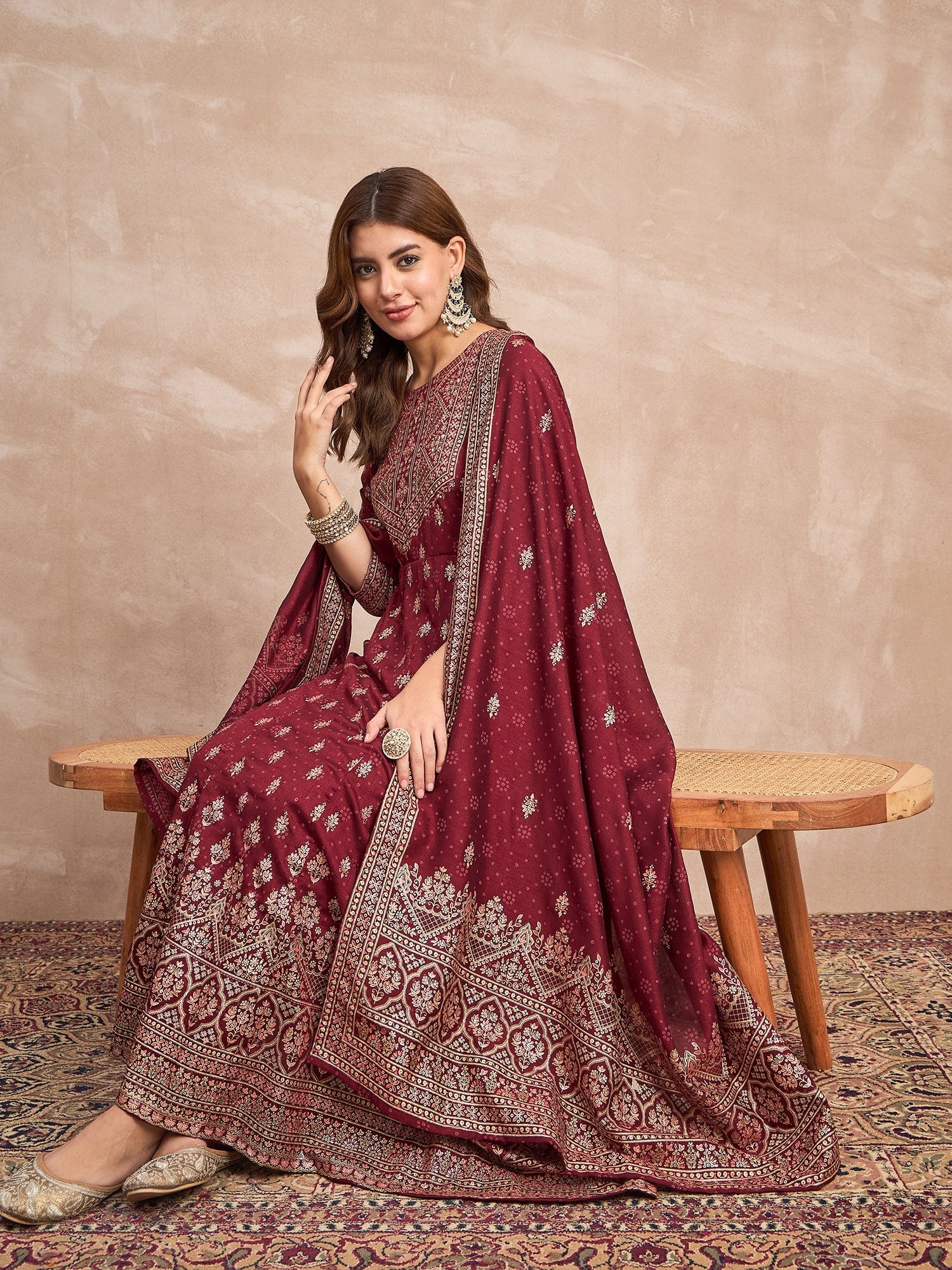Red Anarkali Kurta Paired With Trousers And Printed Dupatta