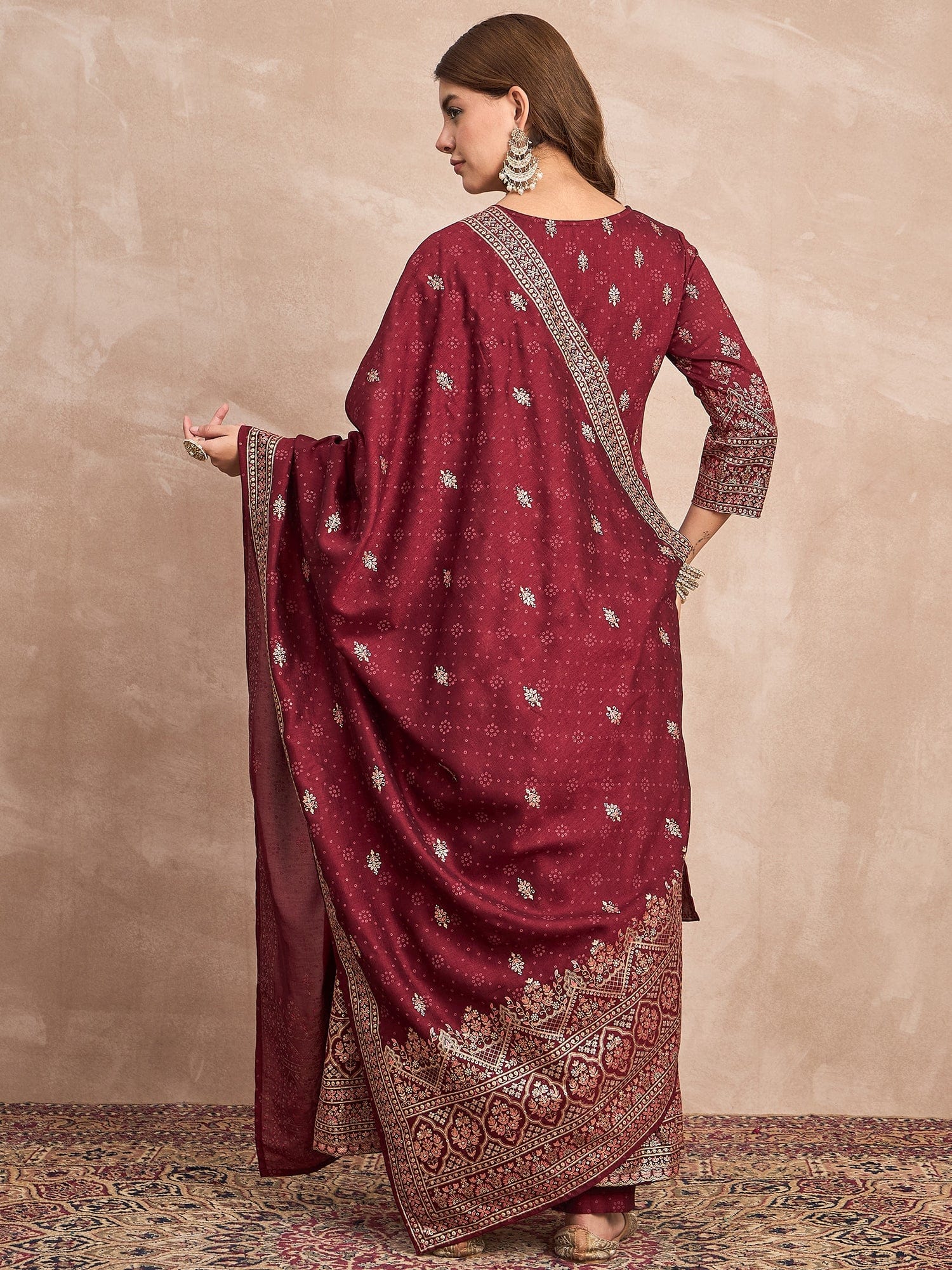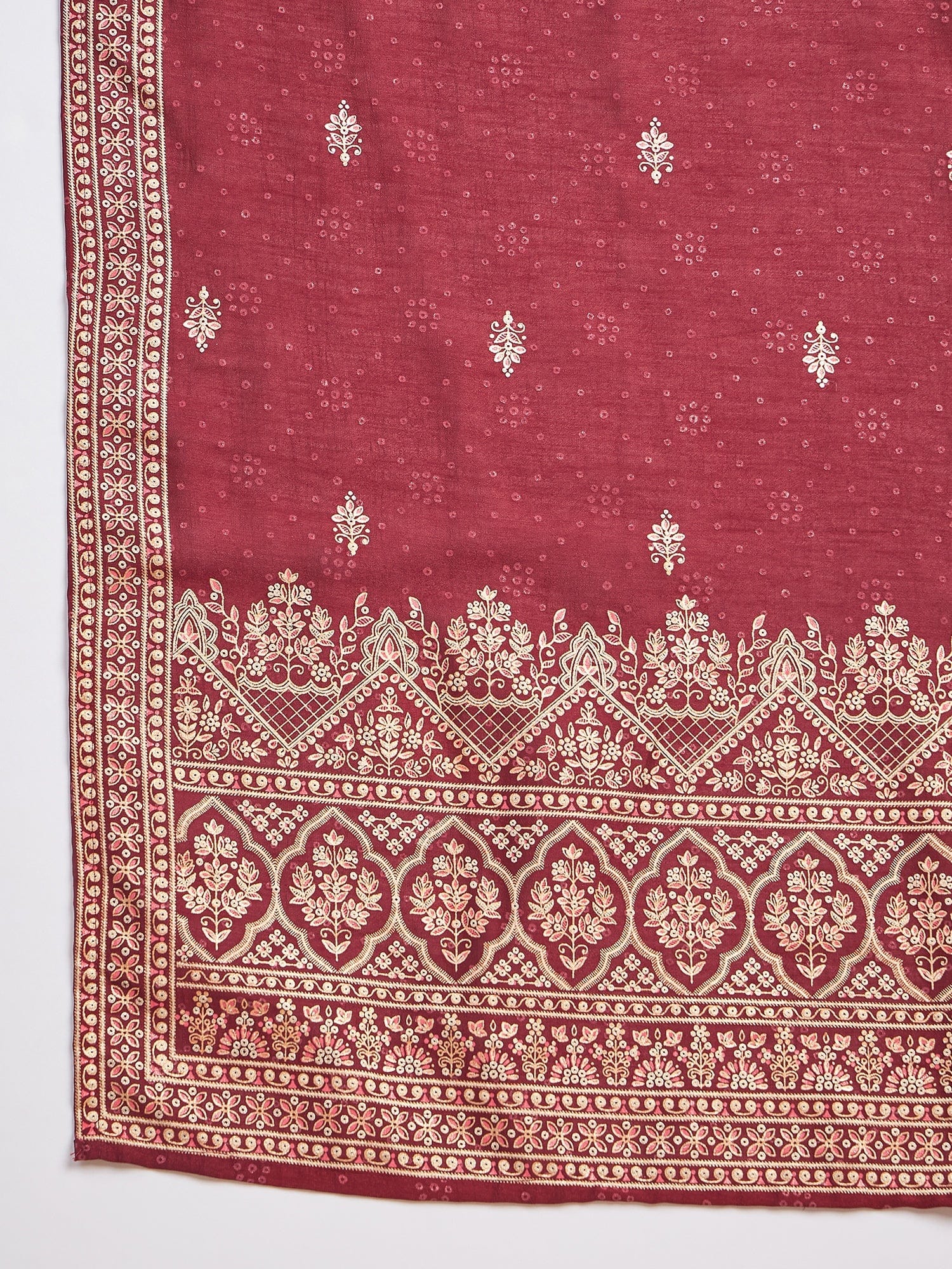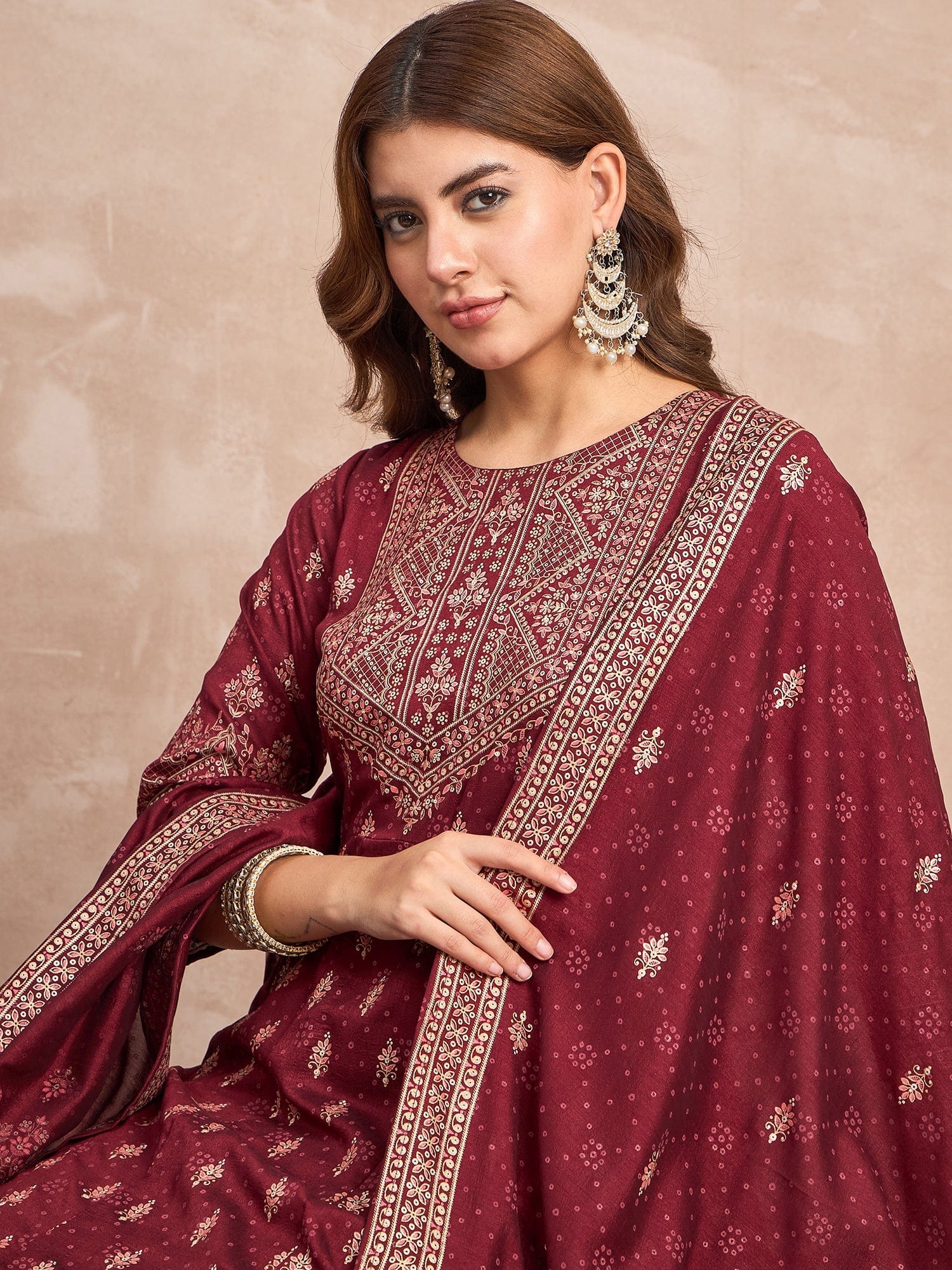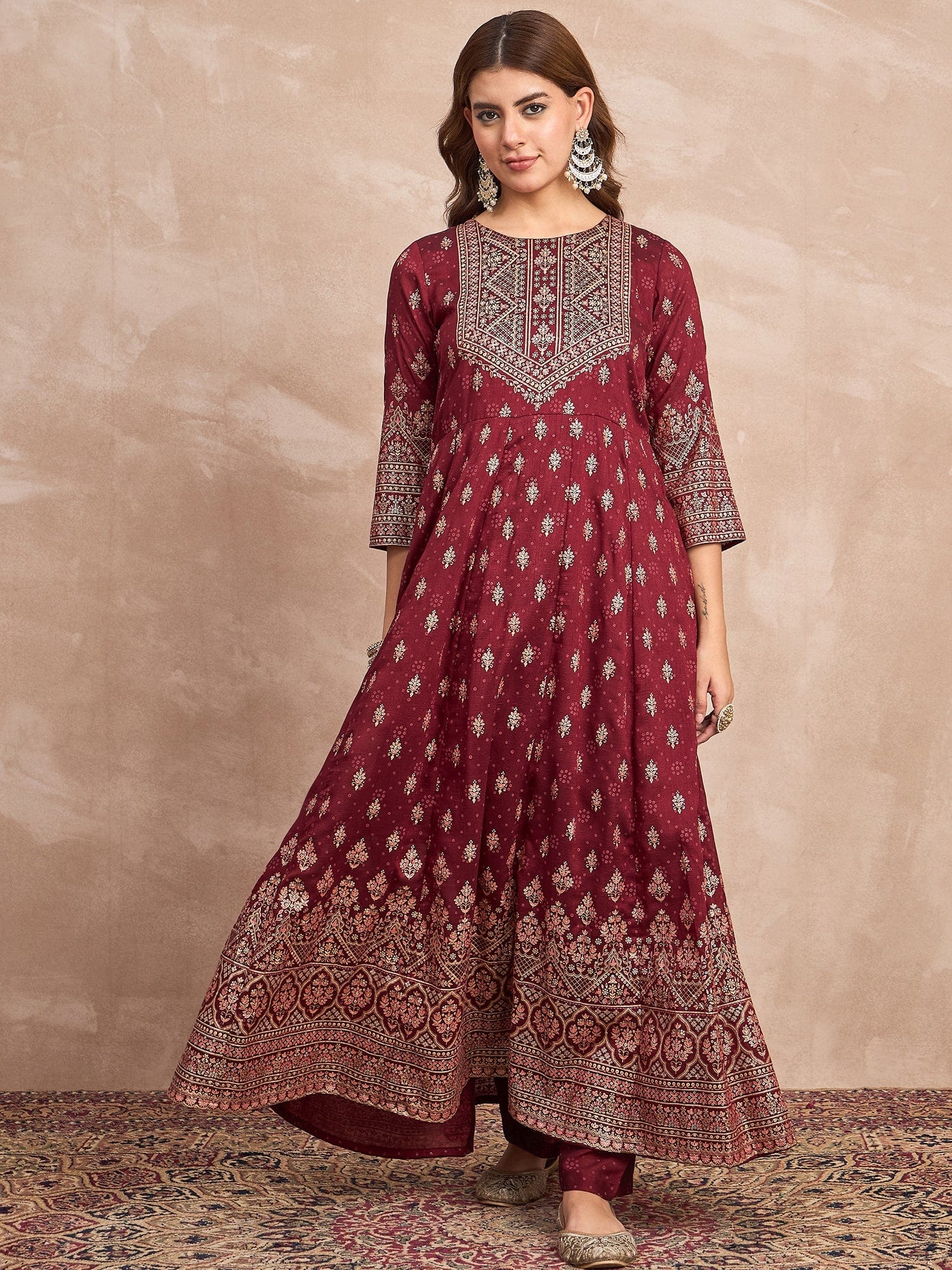 Red Anarkali Kurta Paired With Trousers And Printed Dupatta
