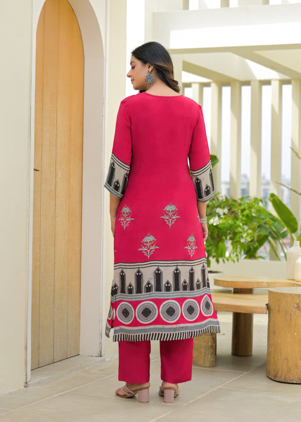 Stylish Fuchsia Straight-Fit Kurta Set with Embellished Yoke, Coordinating Dupatta & Trousers