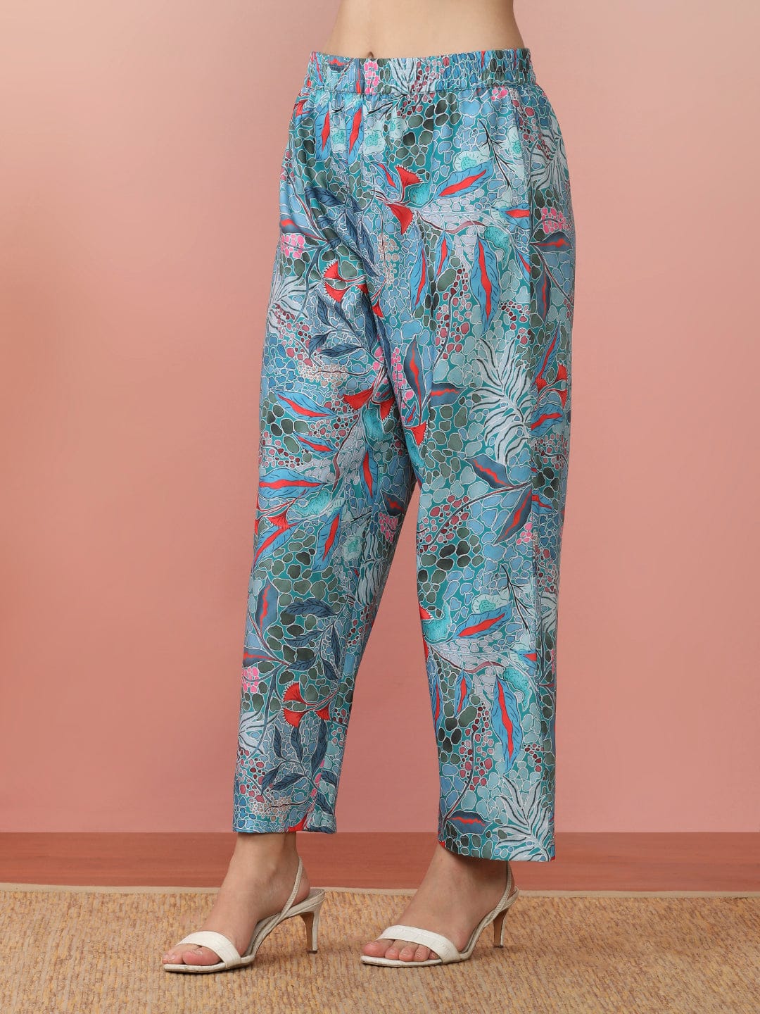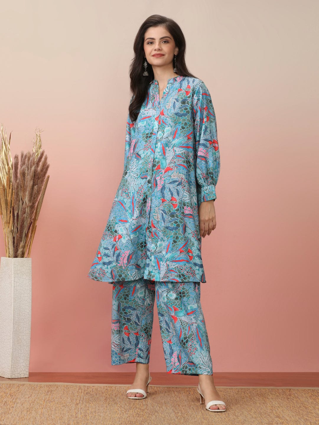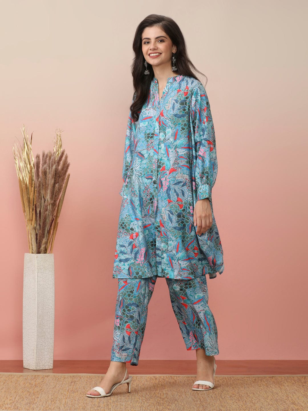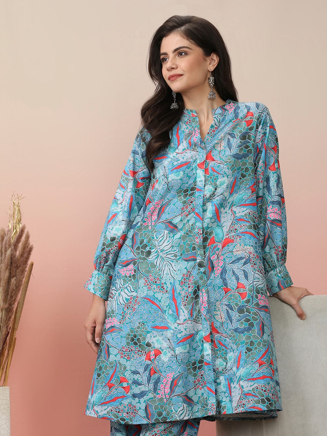 Varanaga sea green abstract printed mandarin collar, bishop sleeves Aline kurta paired with tonal printed bottom