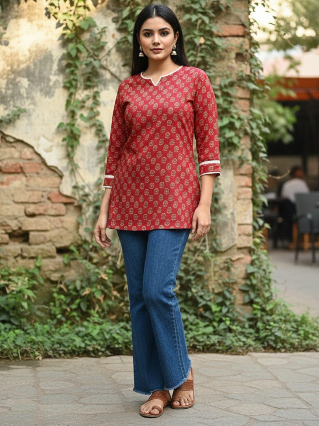 Varanga Ethnic Maroon Paisley Top with Notched V-Neckline