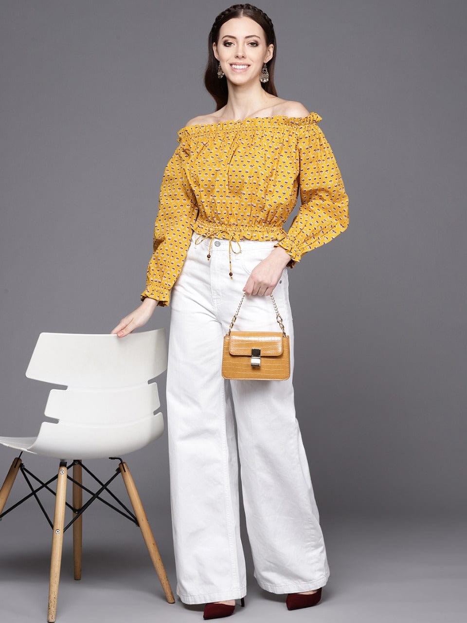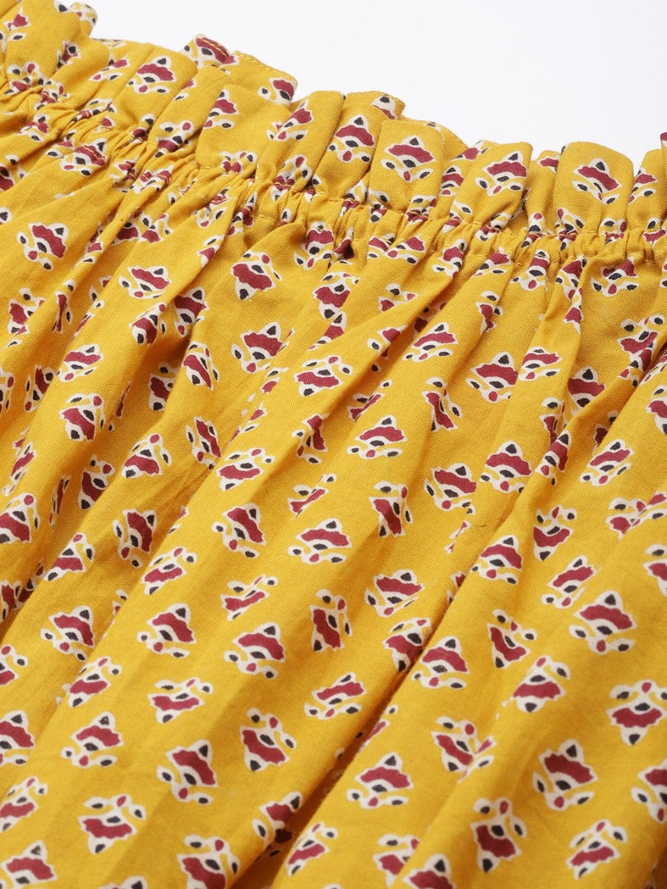 Varanga Women Mustard Yellow Maroon Print Off Shoulder Top