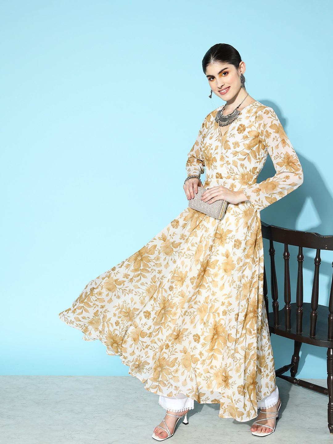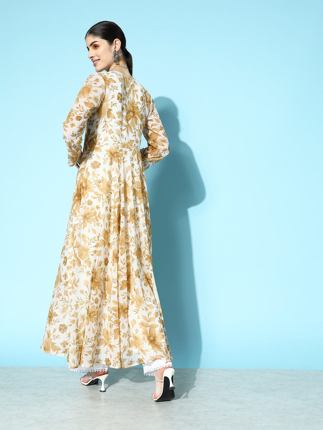 varanga white and beige floral printed floral georgette anarkali v neck kurta