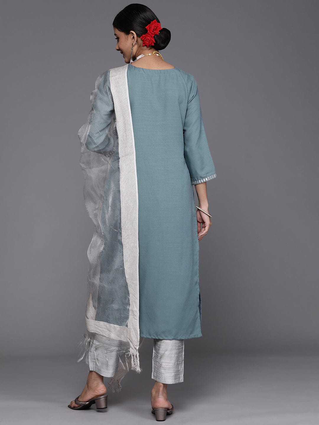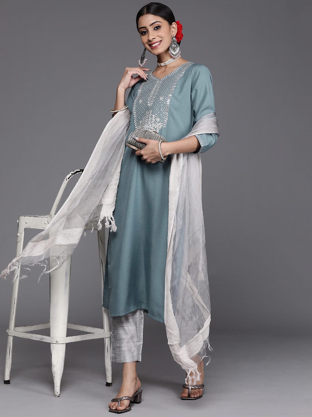 Varanga Women Blue & Silver Sequinned Yoke Design Kurta With Trousers & Dupatta