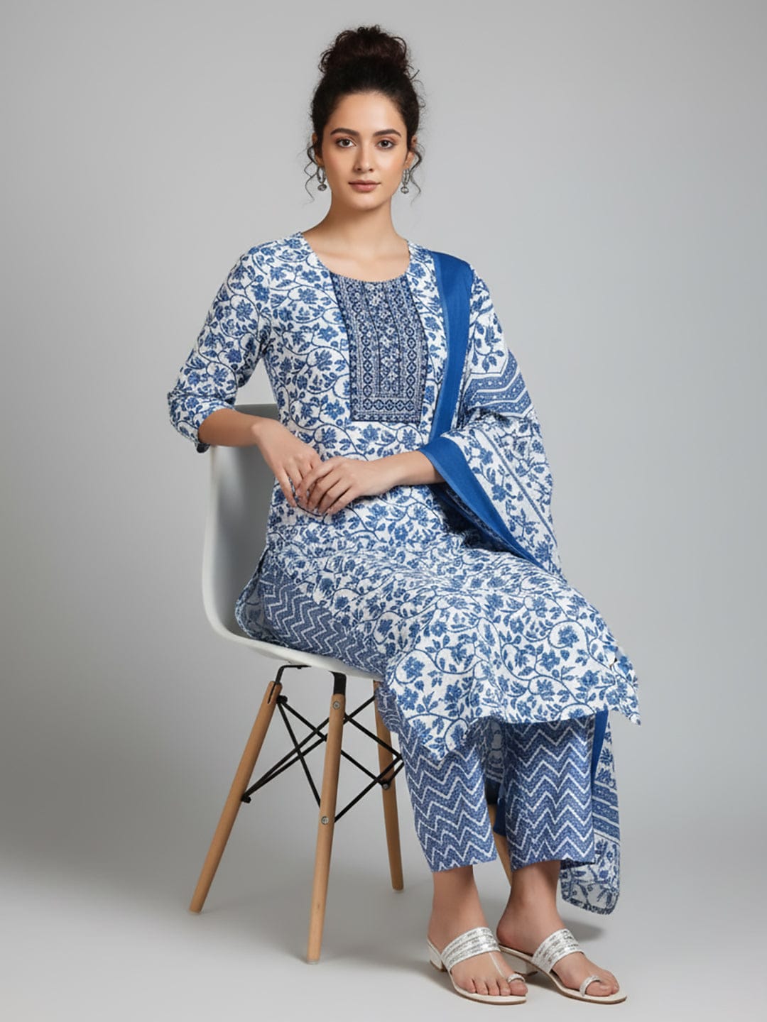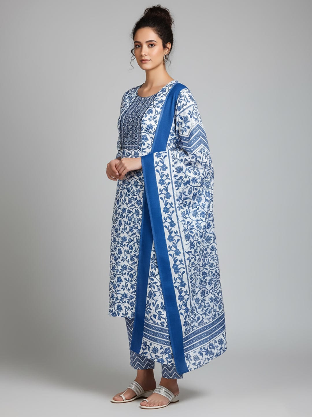Varanga Women Ethnic Floral Printed V Neck Kurta Stripper Trouser & Dupatta
