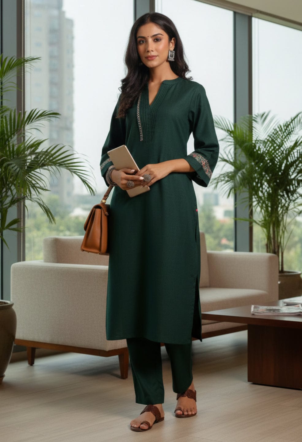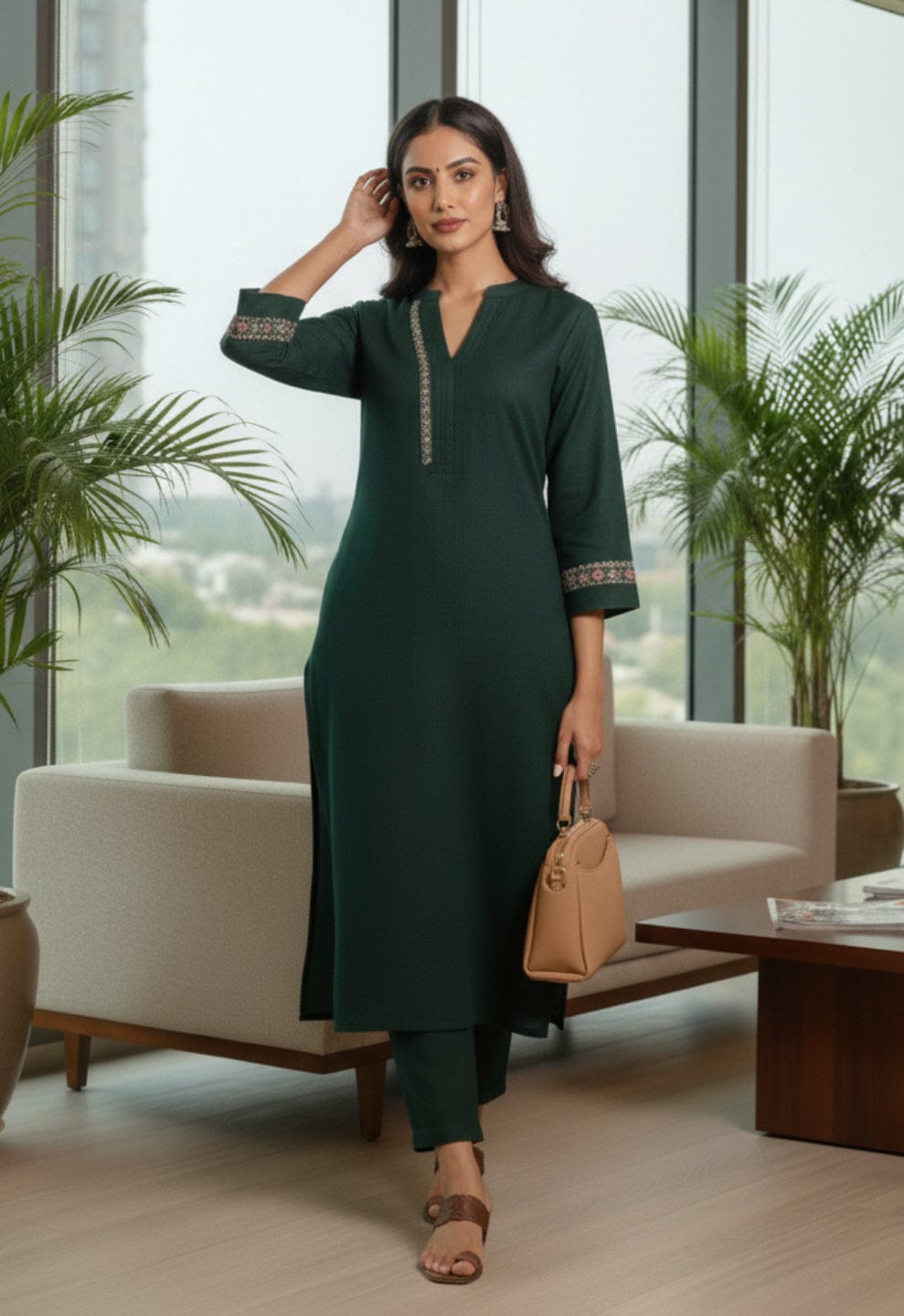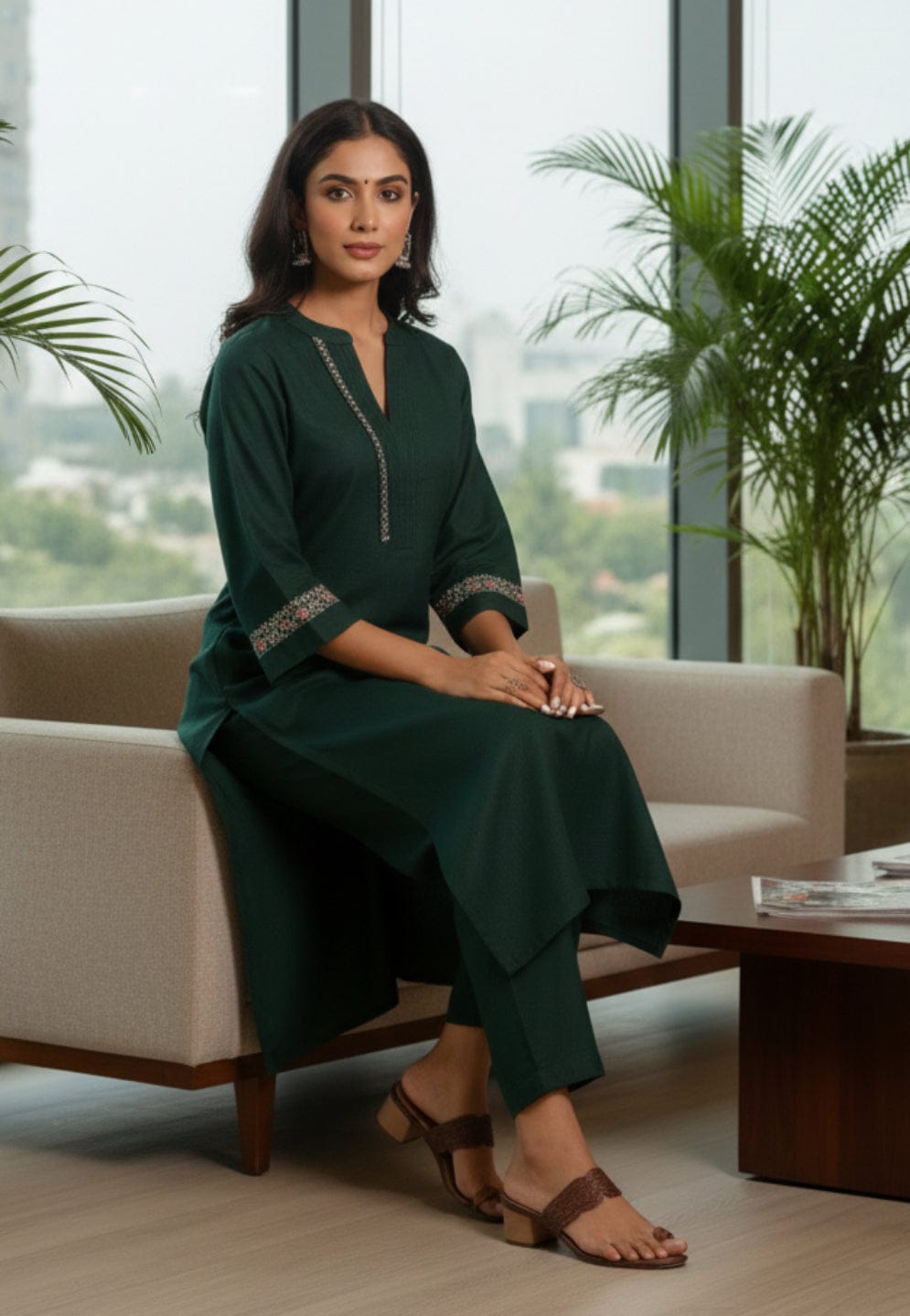 Varanga Women Green Mandarin Collar Thread Embroidered With Pleate Deatialing Kurta Paired With Bottom