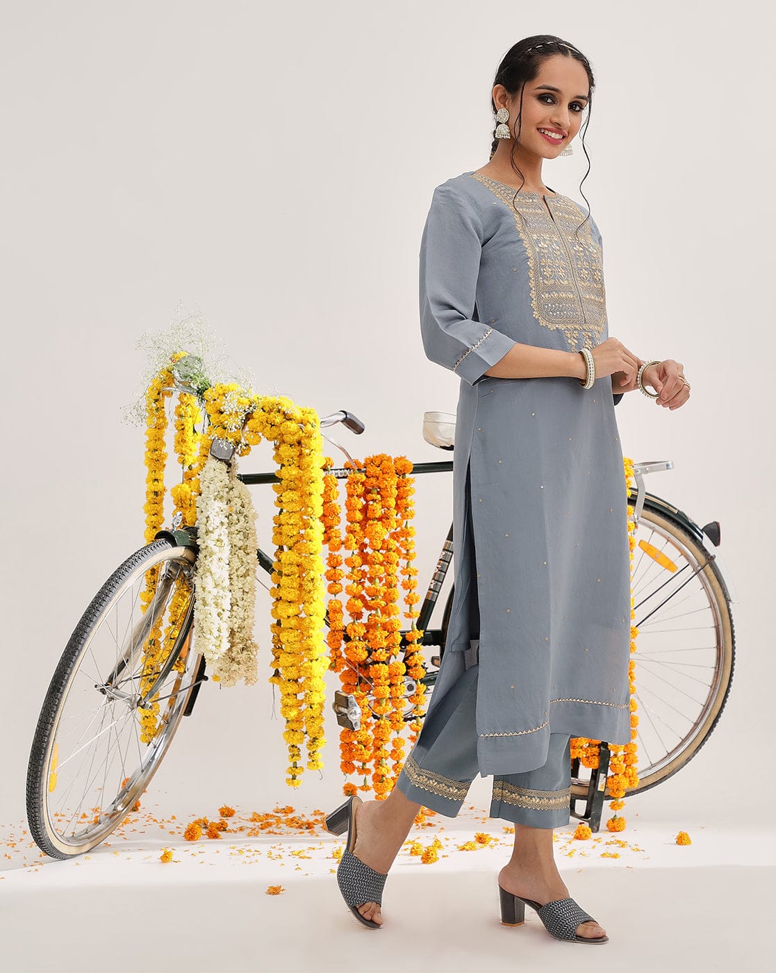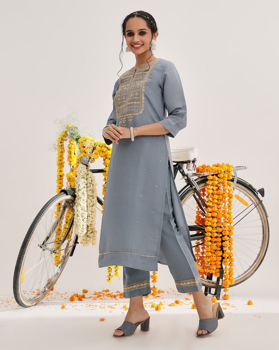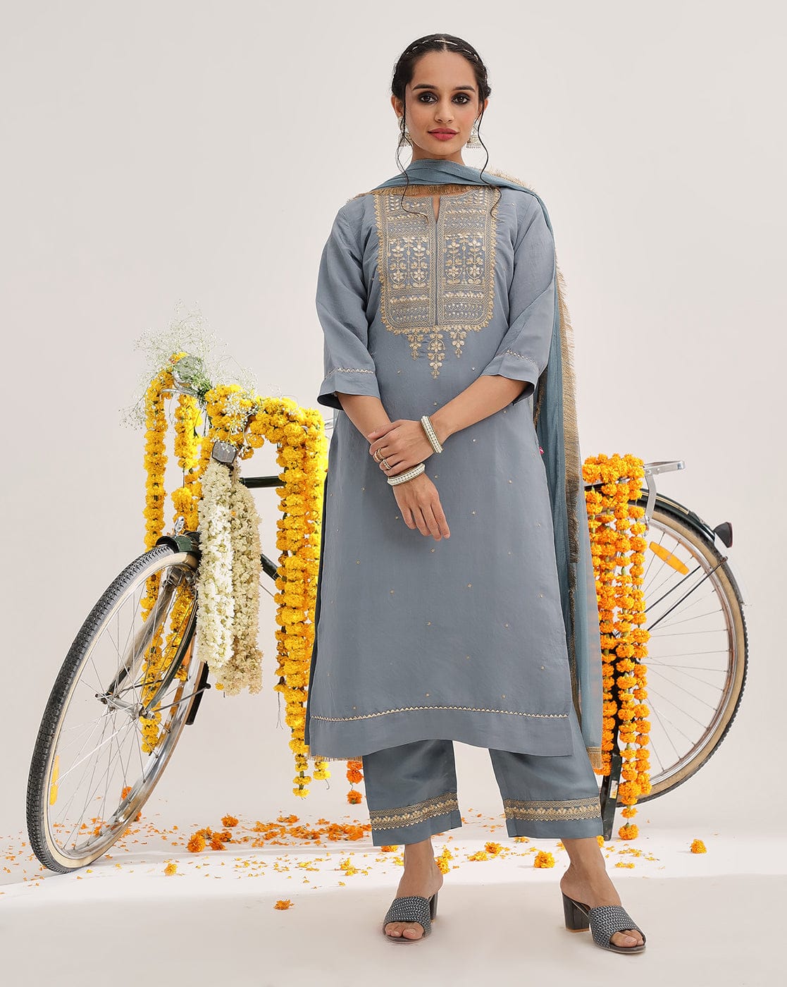 Varanga Women Grey Embroidered Kurta Set With Dupatta