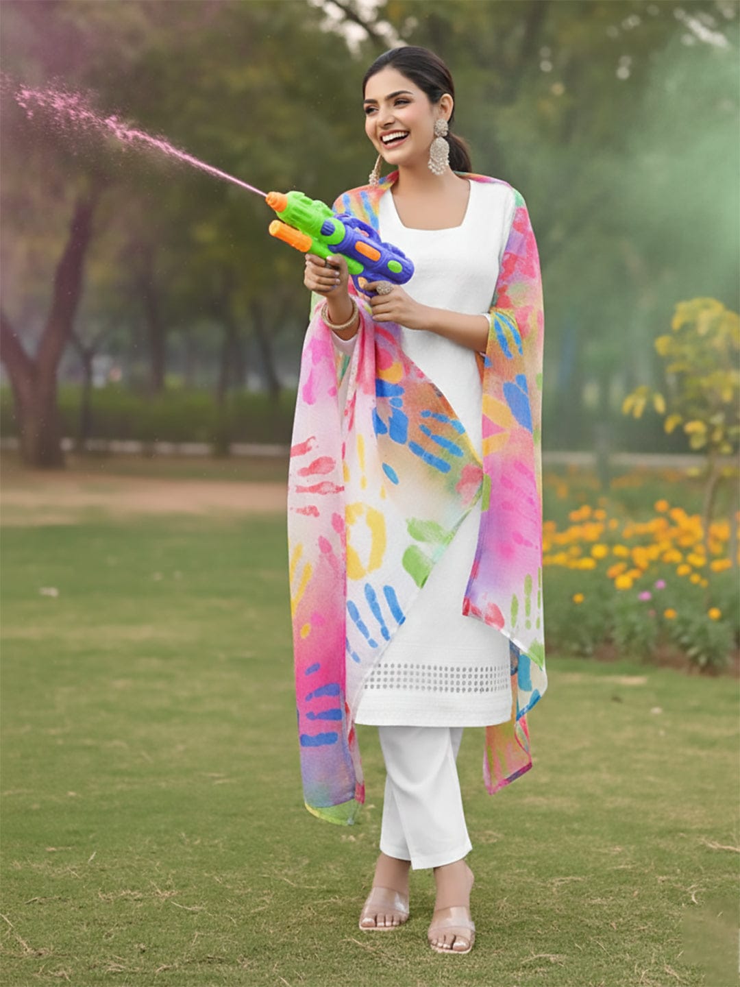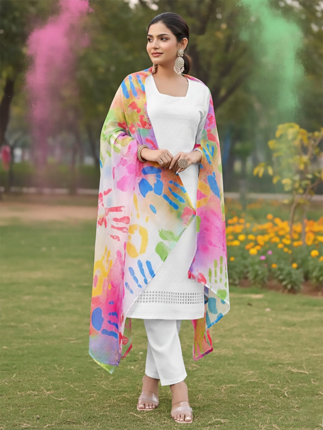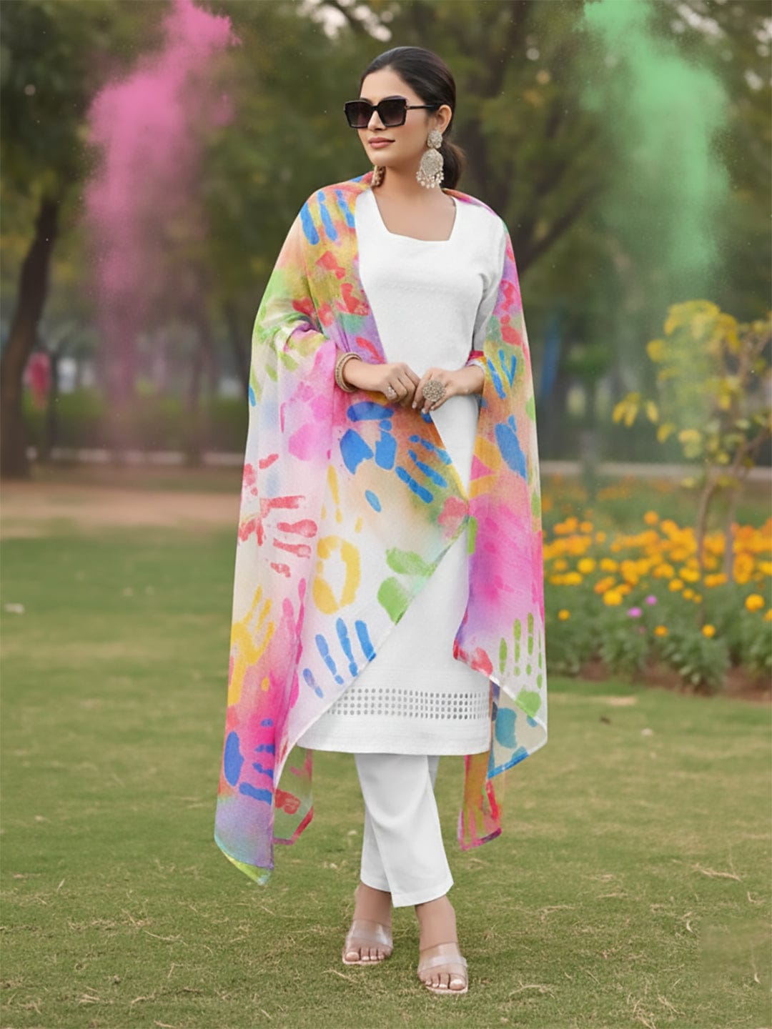 Varanga Women Self Embroidered Schiffli Bordered Kurta with Trouser & Multicolor Dupatta