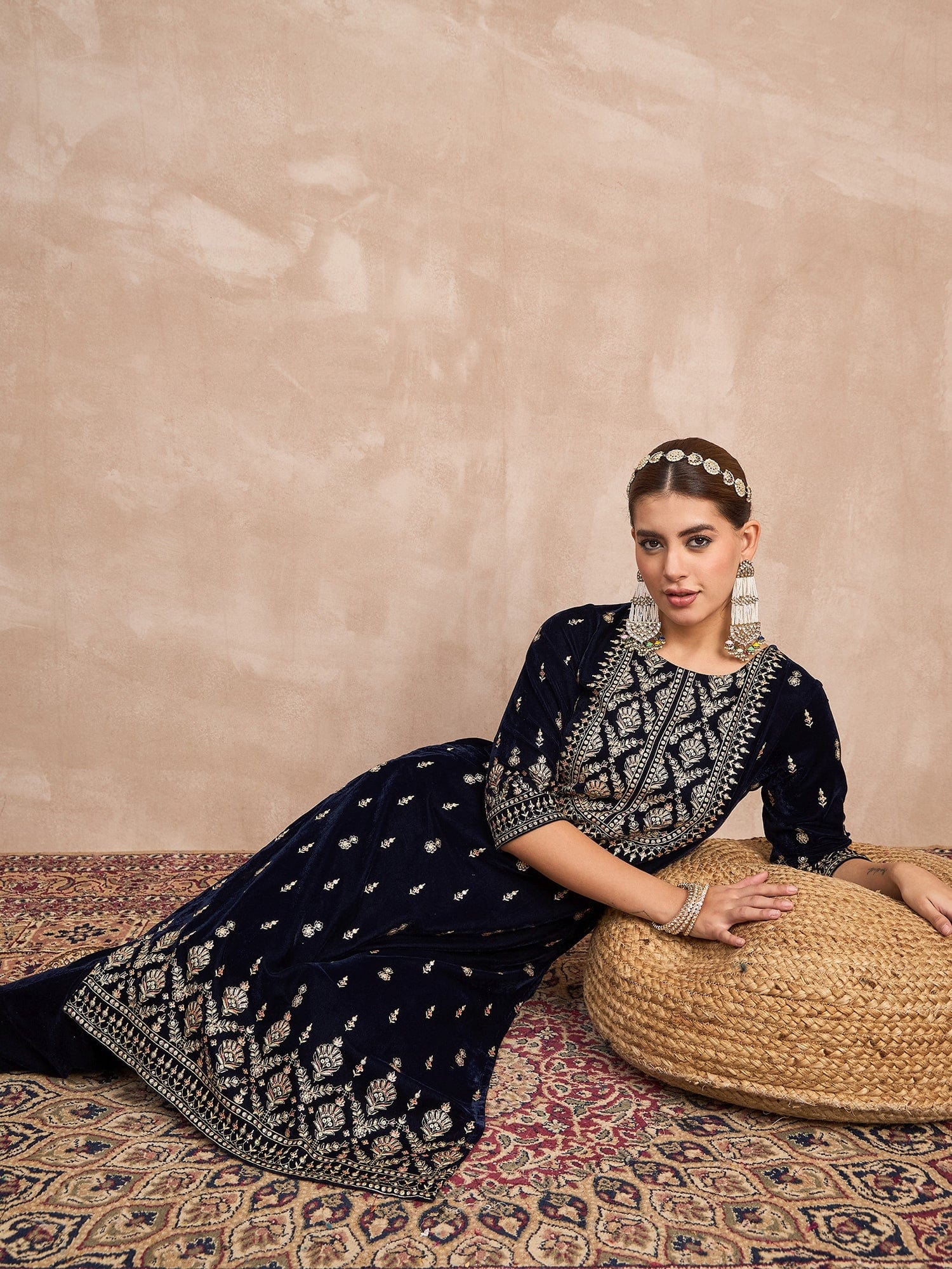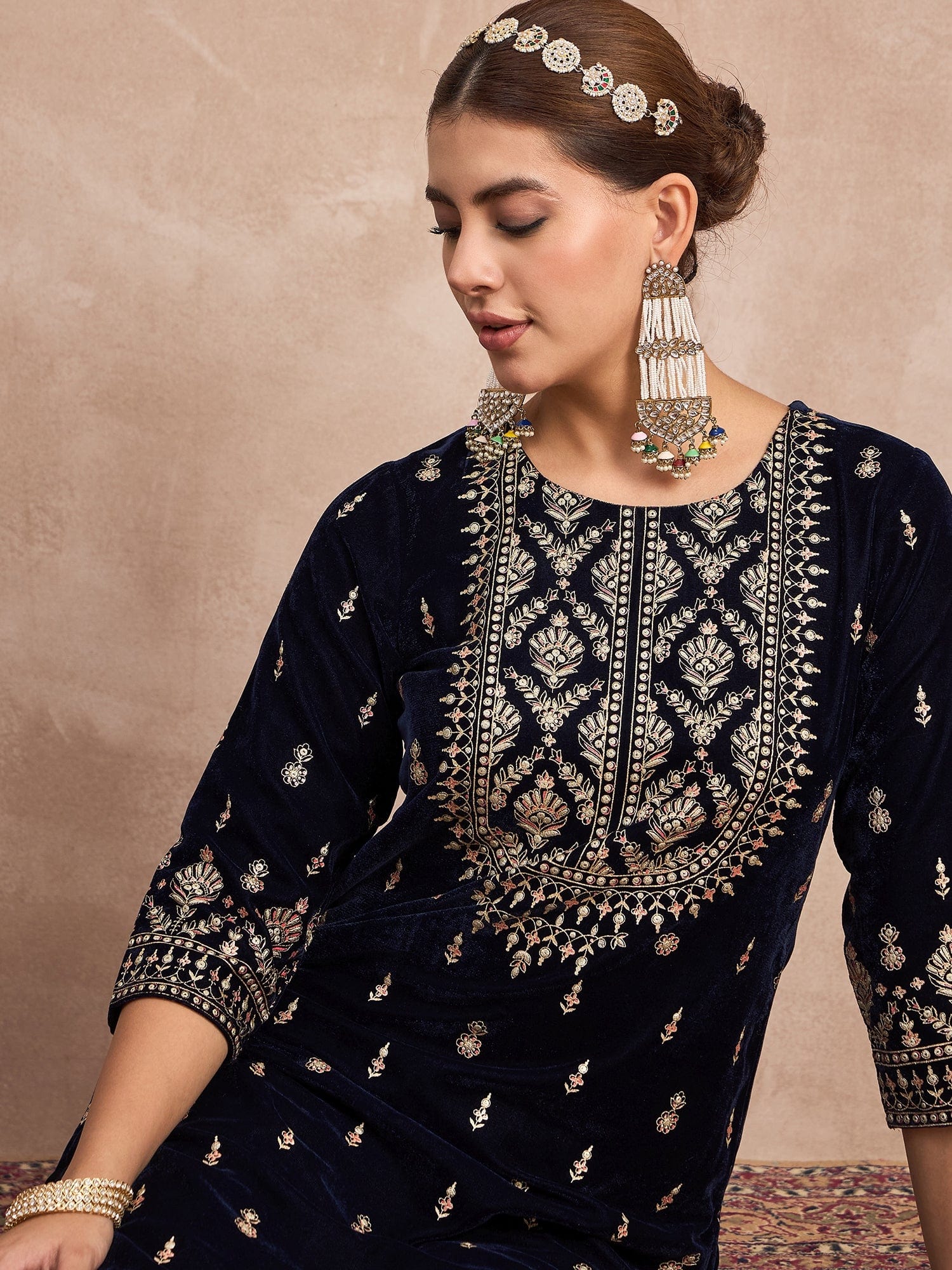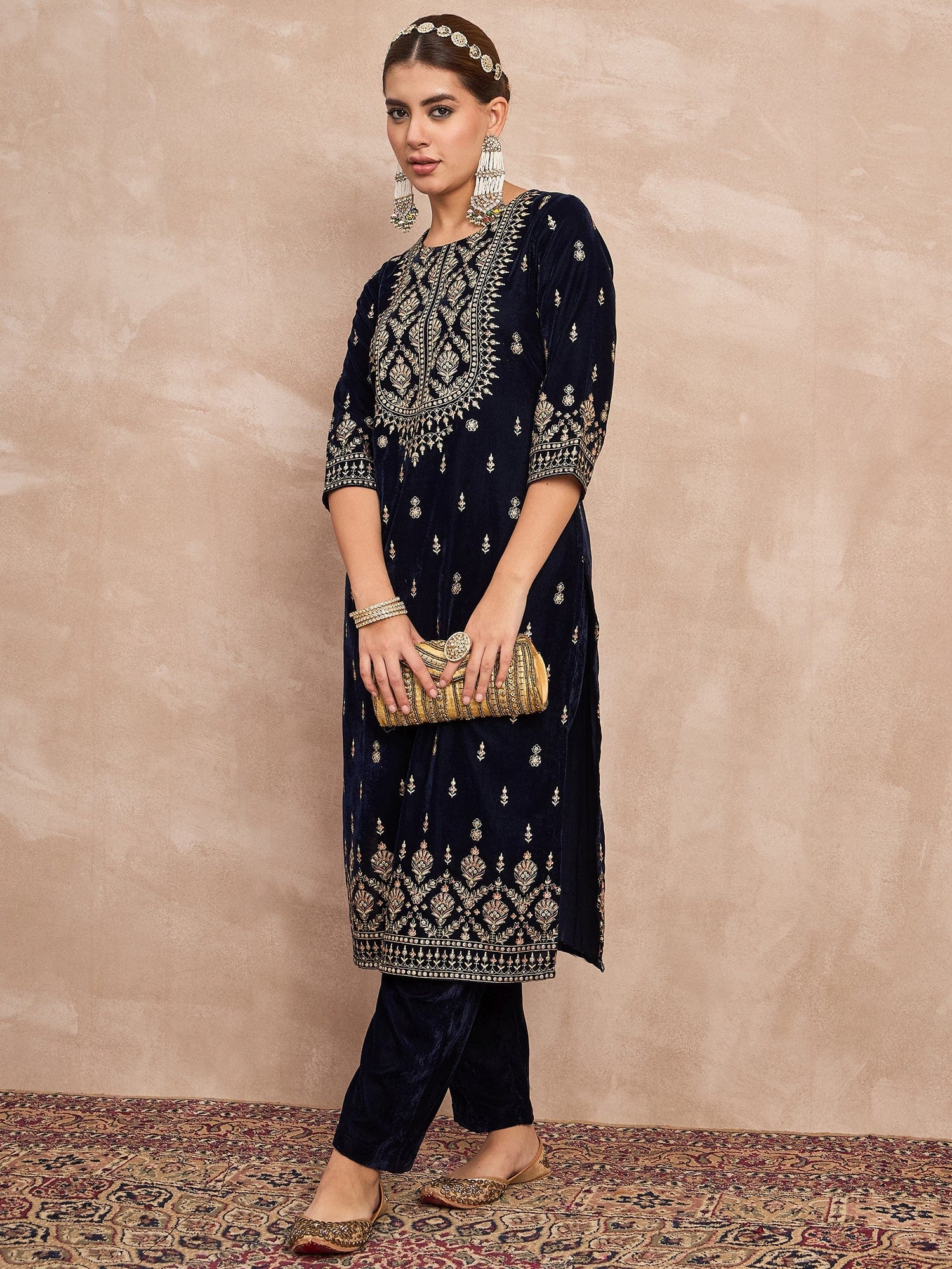 Velvet Kurta With Silver Print, Paired With Trousers For An Elegant, Everyday Look